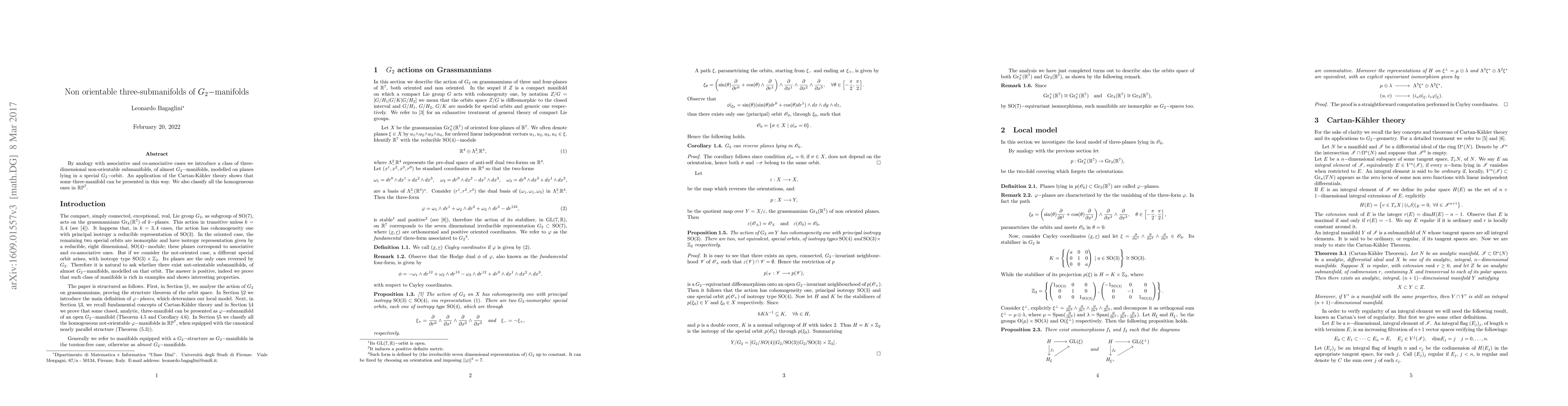 By analogy with associative and co-associative cases we introduce a class of three-dimensional non-orientable submanifolds, of almost $\mathrm{G}_2-$manifolds, modelled on planes lying in a special $\mathrm{G}_2-$orbit. An application of the Cartan-K\"ahler theory shows that some three-manifold can be presented in this way. We also classify all the homogeneous ones in $\mathbb{RP}^7$.
