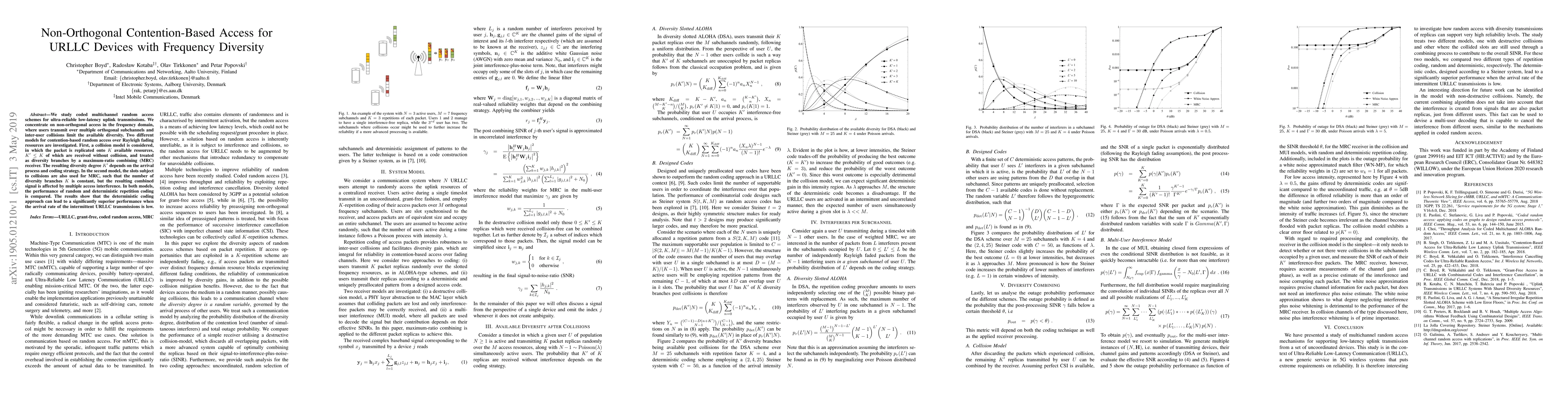 We study coded multichannel random access schemes for ultra-reliable low-latency uplink transmissions. We concentrate on non-orthogonal access in the frequency domain, where users transmit over multiple orthogonal subchannels and inter-user collisions limit the available diversity. Two different models for contention-based random access over Rayleigh fading resources are investigated. First, a collision model is considered, in which the packet is replicated onto $K$ available resources, $K' \leq K$ of which are received without collision, and treated as diversity branches by a maximum-ratio combining (MRC) receiver. The resulting diversity degree $K'$ depends on the arrival process and coding strategy. In the second model, the slots subject to collisions are also used for MRC, such that the number of diversity branches $K$ is constant, but the resulting combined signal is affected by multiple access interference. In both models, the performance of random and deterministic repetition coding is compared. The results show that the deterministic coding approach can lead to a significantly superior performance when the arrival rate of the intermittent URLLC transmissions is low.