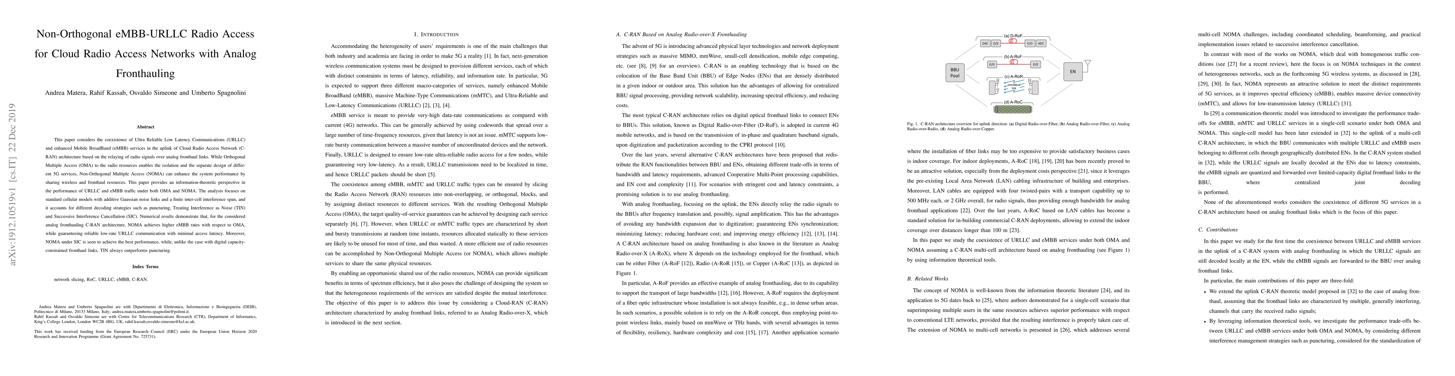 This paper considers the coexistence of Ultra Reliable Low Latency Communications (URLLC) and enhanced Mobile BroadBand (eMBB) services in the uplink of Cloud Radio Access Network (C-RAN) architecture based on the relaying of radio signals over analog fronthaul links. While Orthogonal Multiple Access (OMA) to the radio resources enables the isolation and the separate design of different 5G services, Non-Orthogonal Multiple Access (NOMA) can enhance the system performance by sharing wireless and fronthaul resources. This paper provides an information-theoretic perspective in the performance of URLLC and eMBB traffic under both OMA and NOMA. The analysis focuses on standard cellular models with additive Gaussian noise links and a finite inter-cell interference span, and it accounts for different decoding strategies such as puncturing, Treating Interference as Noise (TIN) and Successive Interference Cancellation (SIC). Numerical results demonstrate that, for the considered analog fronthauling C-RAN architecture, NOMA achieves higher eMBB rates with respect to OMA, while guaranteeing reliable low-rate URLLC communication with minimal access latency. Moreover, NOMA under SIC is seen to achieve the best performance, while, unlike the case with digital capacity-constrained fronthaul links, TIN always outperforms puncturing.