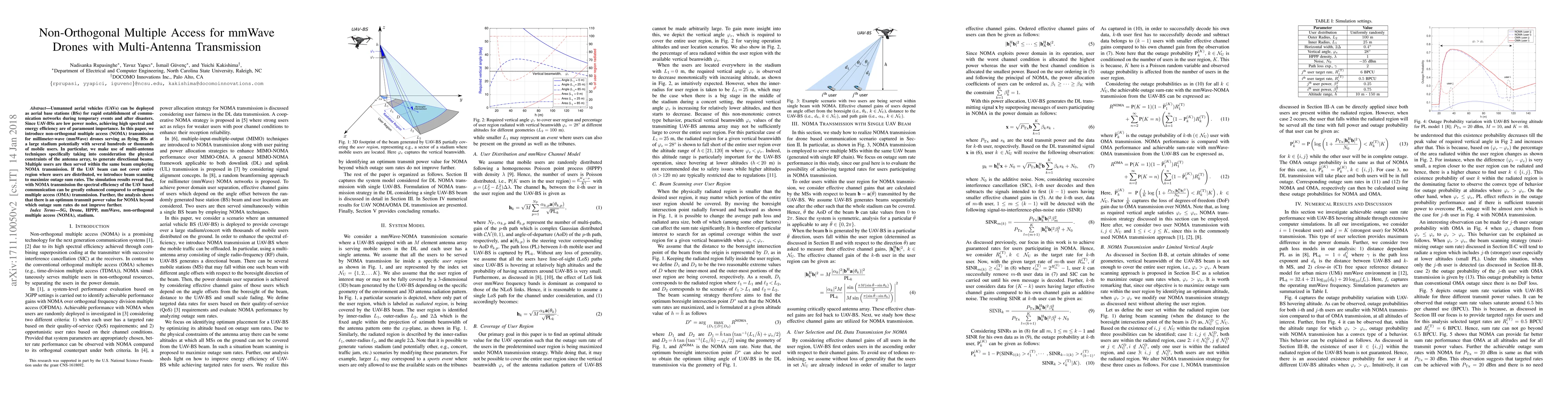 This paper explores non-orthogonal multiple access (NOMA) for mmWave drones functioning as aerial base stations, enhancing spectral efficiency through multi-antenna directional beams and beam scanning. Simulation results show significant gains in spectral efficiency over orthogonal multiple access (OMA) and identify an optimal transmit power for NOMA.