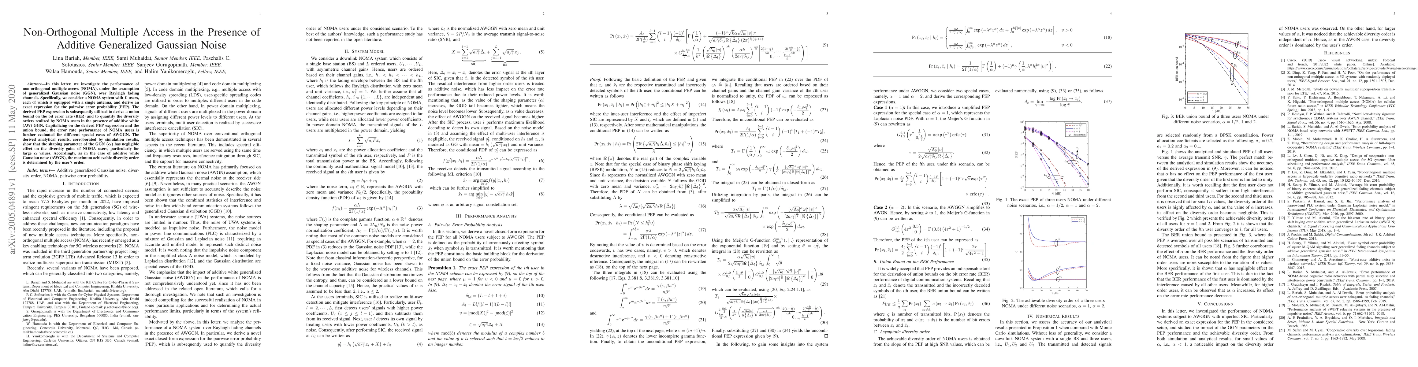 In this letter, we investigate the performance of non-orthogonal multiple access (NOMA), under the assumption of generalized Gaussian noise (GGN), over Rayleigh fading channels. Specifically, we consider a NOMA system with $L$ users, each of which is equipped with a single antenna, and derive an exact expression for the pairwise error probability (PEP). The derived PEP expression is subsequently utilized to derive a union bound on the bit error rate (BER) and to quantify the diversity orders realized by NOMA users in the presence of additive white (AW) GGN. Capitalizing on the derived PEP expression and the union bound, the error rate performance of NOMA users is further evaluated for different special cases of AWGGN. The derived analytical results, corroborated by simulation results, show that the shaping parameter of the GGN $(\alpha)$ has negligible effect on the diversity gains of NOMA users, particularly for large $\alpha$ values. Accordingly, as in the case of additive white Gaussian noise (AWGN), the maximum achievable diversity order is determined by the user's order.