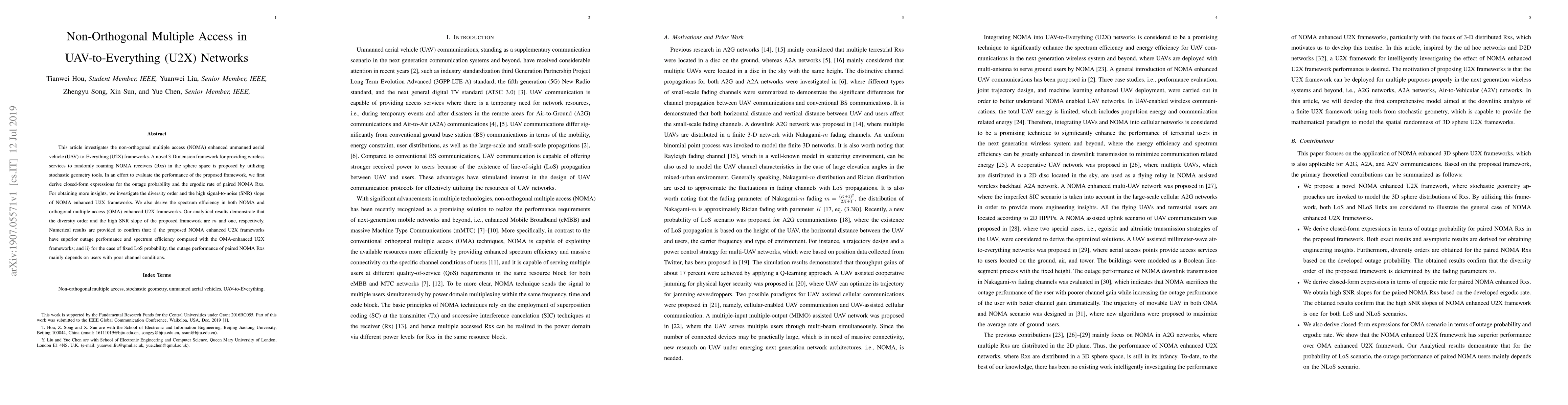 This article investigates the non-orthogonal multiple access (NOMA) enhanced unmanned aerial vehicle (UAV)-to-Everything (U2X) frameworks. A novel 3-Dimension framework for providing wireless services to randomly roaming NOMA receivers (Rxs) in the sphere space is proposed by utilizing stochastic geometry tools. In an effort to evaluate the performance of the proposed framework, we first derive closed-form expressions for the outage probability and the ergodic rate of paired NOMA Rxs. For obtaining more insights, we investigate the diversity order and the high signal-to-noise (SNR) slope of NOMA enhanced U2X frameworks. We also derive the spectrum efficiency in both NOMA and orthogonal multiple access (OMA) enhanced U2X frameworks. Our analytical results demonstrate that the diversity order and the high SNR slope of the proposed framework are $m$ and one, respectively. Numerical results are provided to confirm that: i) the proposed NOMA enhanced U2X frameworks have superior outage performance and spectrum efficiency compared with the OMA-enhanced U2X frameworks; and ii) for the case of fixed LoS probability, the outage performance of paired NOMA Rxs mainly depends on users with poor channel conditions.
