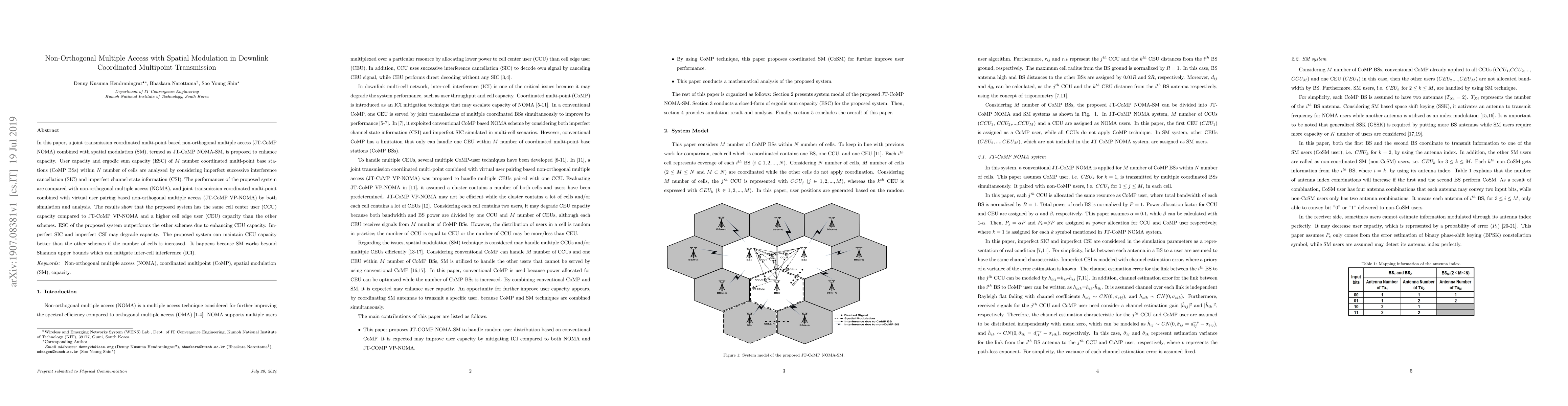 This paper proposes a joint transmission coordinated multi-point based non-orthogonal multiple access (JT-COMP NOMA) combined with spatial modulation (SM) to enhance capacity. The system outperforms other schemes in cell edge user capacity and ergodic sum capacity, especially in scenarios with imperfect successive interference cancellation and channel state information.