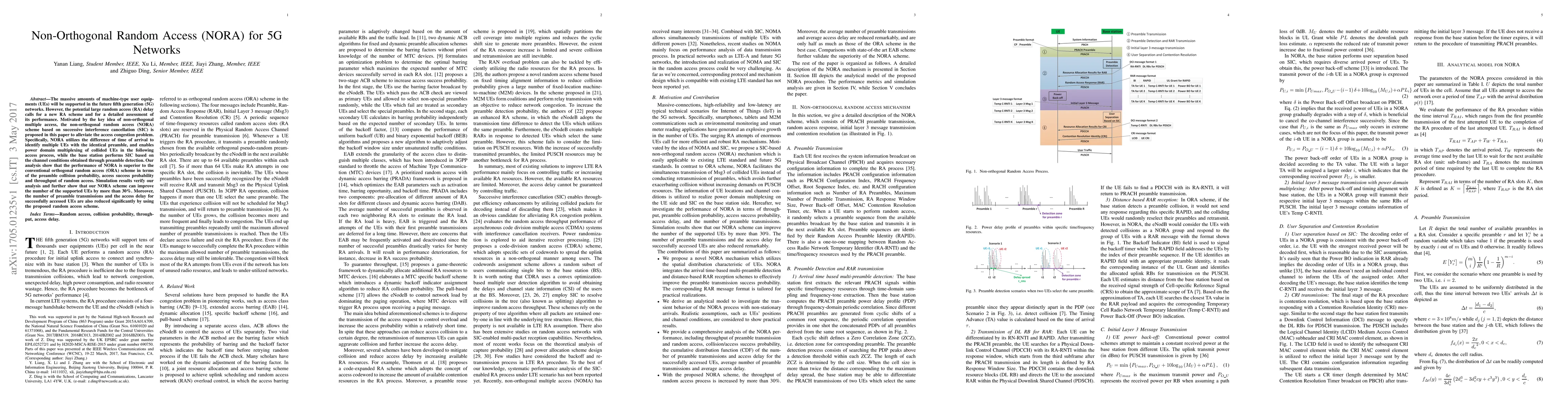 The paper proposes a Non-Orthogonal Random Access (NORA) scheme for 5G networks to address massive machine-type user equipment access congestion, utilizing successive interference cancellation and power domain multiplexing. NORA outperforms conventional orthogonal random access in terms of collision probability, access success, and throughput, supporting over 30% more UEs with reduced preamble transmissions and access delay.