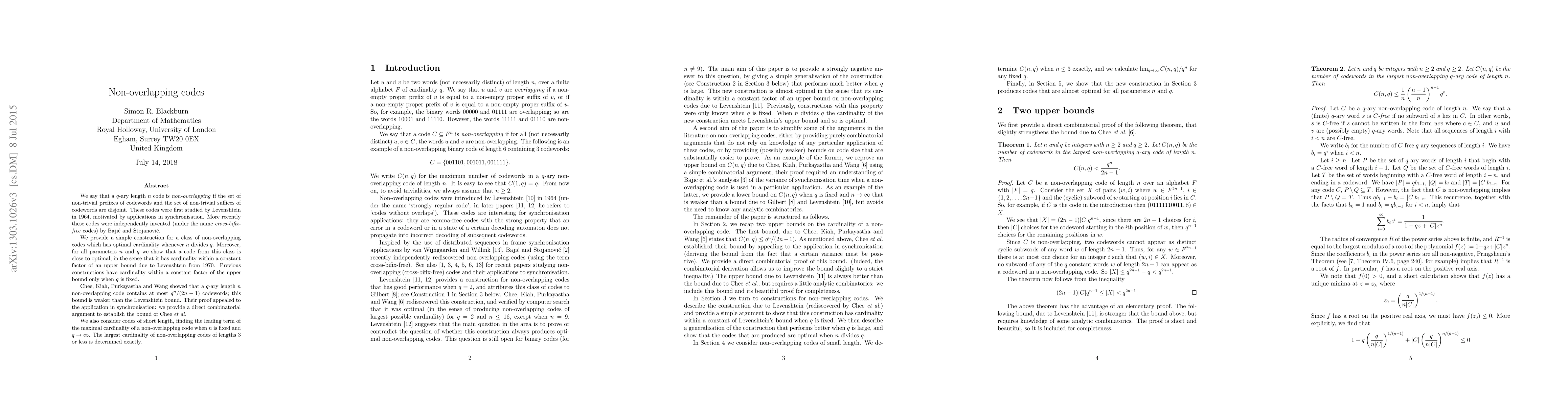 We say that a $q$-ary length $n$ code is \emph{non-overlapping} if the set of non-trivial prefixes of codewords and the set of non-trivial suffices of codewords are disjoint. These codes were first studied by Levenshtein in 1964, motivated by applications in synchronisation. More recently these codes were independently invented (under the name \emph{cross-bifix-free} codes) by Baji\'c and Stojanovi\'c. We provide a simple construction for a class of non-overlapping codes which has optimal cardinality whenever $n$ divides $q$. Moreover, for all parameters $n$ and $q$ we show that a code from this class is close to optimal, in the sense that it has cardinality within a constant factor of an upper bound due to Levenshtein from 1970. Previous constructions have cardinality within a constant factor of the upper bound only when $q$ is fixed. Chee, Kiah, Purkayastha and Wang showed that a $q$-ary length $n$ non-overlapping code contains at most $q^n/(2n-1)$ codewords; this bound is weaker than the Levenshtein bound. Their proof appealed to the application in synchronisation: we provide a direct combinatorial argument to establish the bound of Chee \emph{et al}. We also consider codes of short length, finding the leading term of the maximal cardinality of a non-overlapping code when $n$ is fixed and $q\rightarrow \infty$. The largest cardinality of non-overlapping codes of lengths $3$ or less is determined exactly.