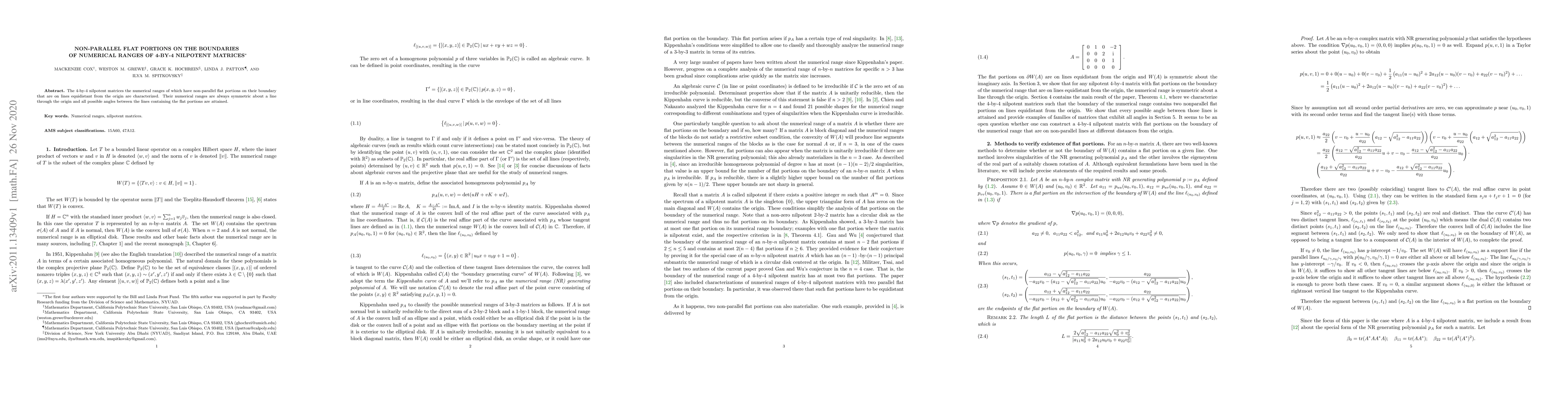 Summary: This paper characterizes 4-by-4 nilpotent matrices whose numerical ranges exhibit non-parallel flat portions equidistant from the origin. These ranges are symmetric about a line through the origin, and all possible angles between the lines of the flat portions are realized.