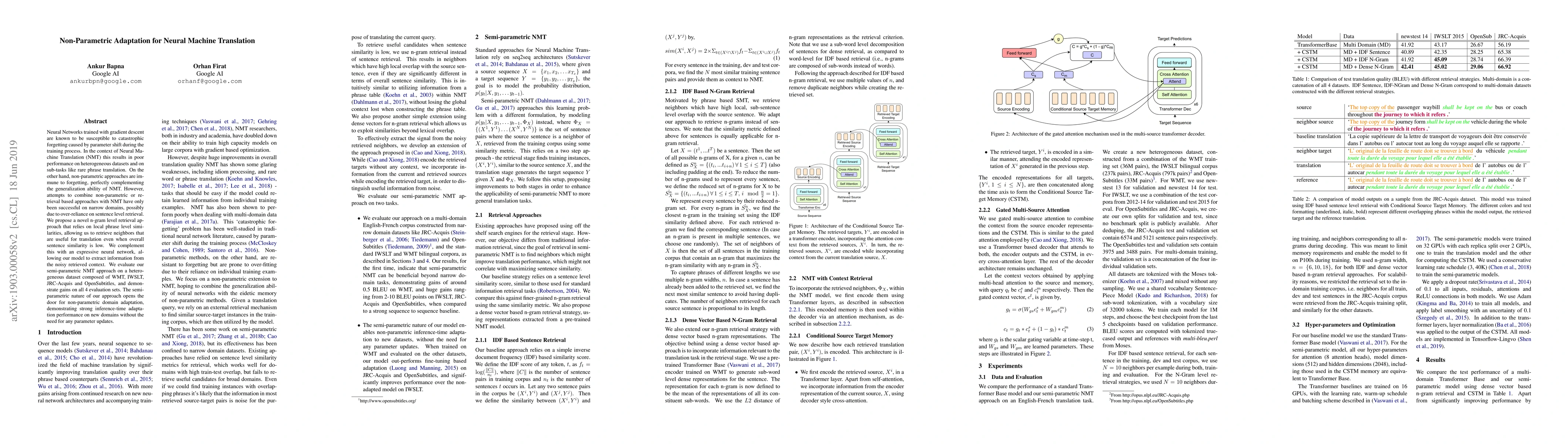 This paper proposes a semi-parametric Neural Machine Translation (NMT) approach that combines n-gram level retrieval with a neural network to mitigate catastrophic forgetting and improve performance on heterogeneous datasets. The method demonstrates strong inference-time adaptation without requiring parameter updates, showing gains across multiple evaluation sets.