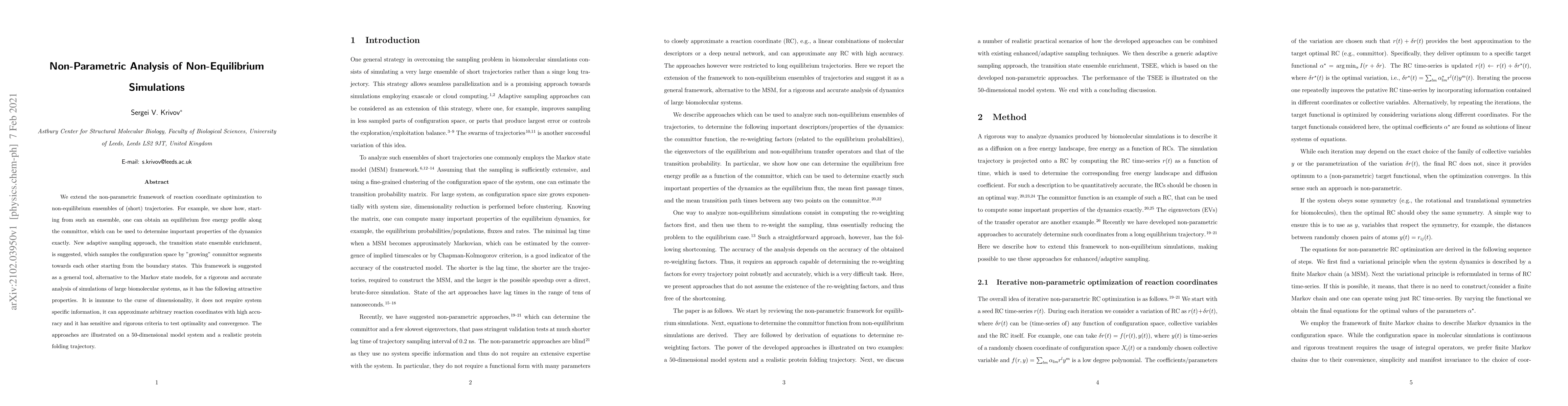 We extend the non-parametric framework of reaction coordinate optimization to non-equilibrium ensembles of (short) trajectories. For example, we show how, starting from such an ensemble, one can obtain an equilibrium free energy profile along the committor, which can be used to determine important properties of the dynamics exactly. New adaptive sampling approach, the transition state ensemble enrichment, is suggested, which samples the configuration space by "growing" committor segments towards each other starting from the boundary states. This framework is suggested as a general tool, alternative to the Markov state models, for a rigorous and accurate analysis of simulations of large biomolecular systems, as it has the following attractive properties. It is immune to the curse of dimensionality, it does not require system specific information, it can approximate arbitrary reaction coordinates with high accuracy and it has sensitive and rigorous criteria to test optimality and convergence. The approaches are illustrated on a 50-dimensional model system and a realistic protein folding trajectory.