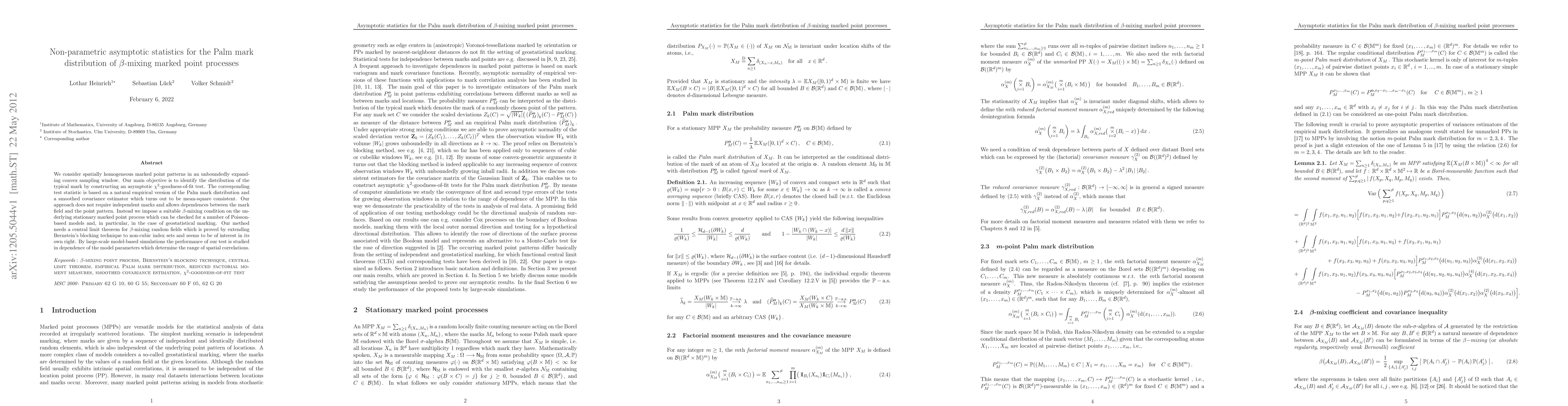 This paper develops non-parametric asymptotic statistics for the Palm mark distribution of β-mixing marked point processes, constructing an asymptotic χ²-goodness-of-fit test based on empirical mark distribution and a consistent covariance estimator. The method accommodates dependent marks and is validated through large-scale simulations.