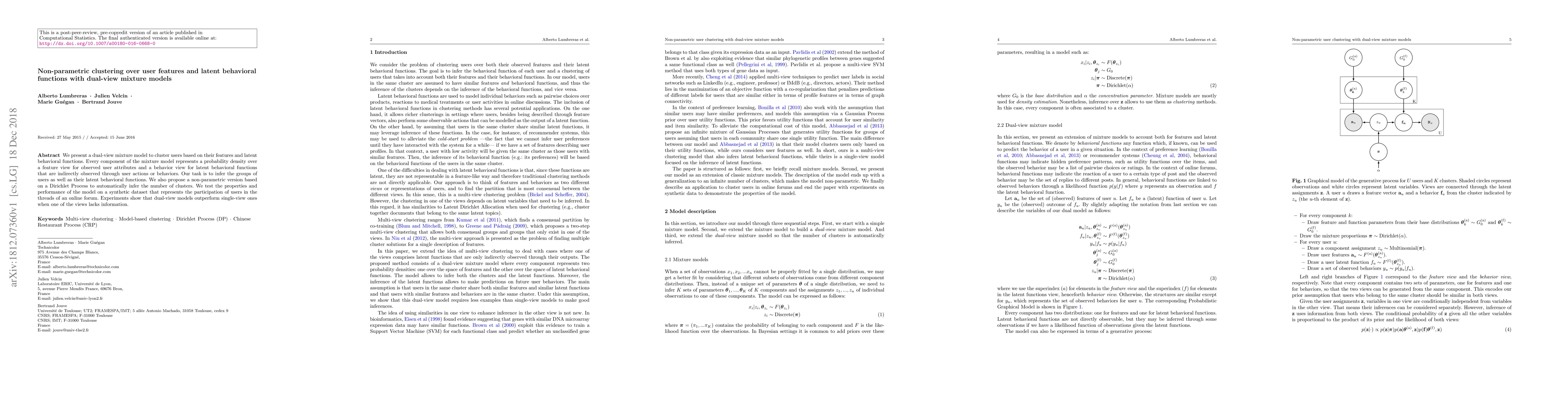 We present a dual-view mixture model to cluster users based on their features and latent behavioral functions. Every component of the mixture model represents a probability density over a feature view for observed user attributes and a behavior view for latent behavioral functions that are indirectly observed through user actions or behaviors. Our task is to infer the groups of users as well as their latent behavioral functions. We also propose a non-parametric version based on a Dirichlet Process to automatically infer the number of clusters. We test the properties and performance of the model on a synthetic dataset that represents the participation of users in the threads of an online forum. Experiments show that dual-view models outperform single-view ones when one of the views lacks information.