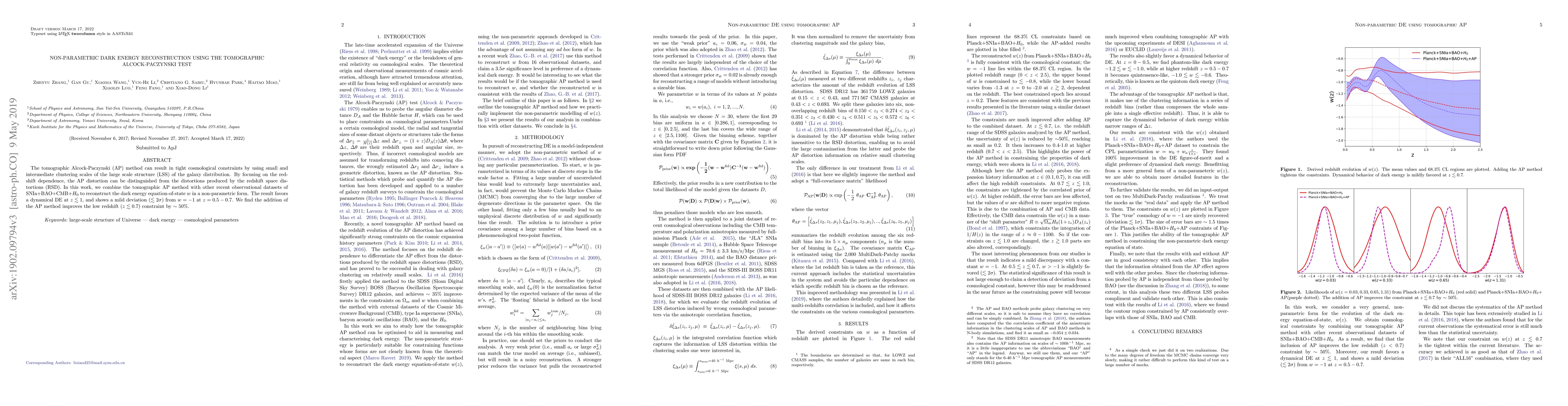 The tomographic Alcock-Paczynski (AP) method can result in tight cosmological constraints by using small and intermediate clustering scales of the large scale structure (LSS) of the galaxy distribution. By focusing on the redshift dependence, the AP distortion can be distinguished from the distortions produced by the redshift space distortions (RSD). In this work, we combine the tomographic AP method with other recent observational datasets of SNIa+BAO+CMB+$H_0$ to reconstruct the dark energy equation-of-state $w$ in a non-parametric form. The result favors a dynamical DE at $z\lesssim1$, and shows a mild deviation ($\lesssim2\sigma$) from $w=-1$ at $z=0.5-0.7$. We find the addition of the AP method improves the low redshift ($z\lesssim0.7$) constraint by $\sim50\%$.