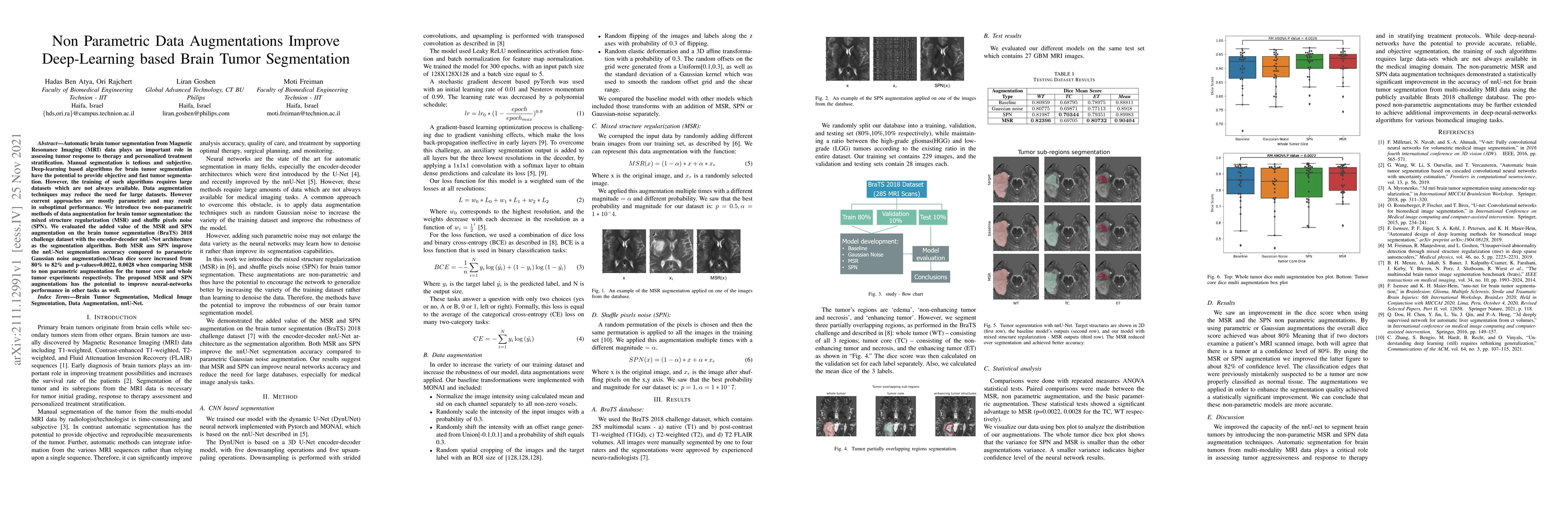 Automatic brain tumor segmentation from Magnetic Resonance Imaging (MRI) data plays an important role in assessing tumor response to therapy and personalized treatment stratification.Manual segmentation is tedious and subjective.Deep-learning-based algorithms for brain tumor segmentation have the potential to provide objective and fast tumor segmentation.However, the training of such algorithms requires large datasets which are not always available. Data augmentation techniques may reduce the need for large datasets.However current approaches are mostly parametric and may result in suboptimal performance.We introduce two non-parametric methods of data augmentation for brain tumor segmentation: the mixed structure regularization (MSR) and shuffle pixels noise (SPN).We evaluated the added value of the MSR and SPN augmentation on the brain tumor segmentation (BraTS) 2018 challenge dataset with the encoder-decoder nnU-Net architecture as the segmentation algorithm.Both MSR and SPN improve the nnU-Net segmentation accuracy compared to parametric Gaussian noise augmentation.Mean dice score increased from 80% to 82% and p-values=0.0022, 0.0028 when comparing MSR to non-parametric augmentation for the tumor core and whole tumor experiments respectively.The proposed MSR and SPN augmentations have the potential to improve neural-networks performance in other tasks as well.