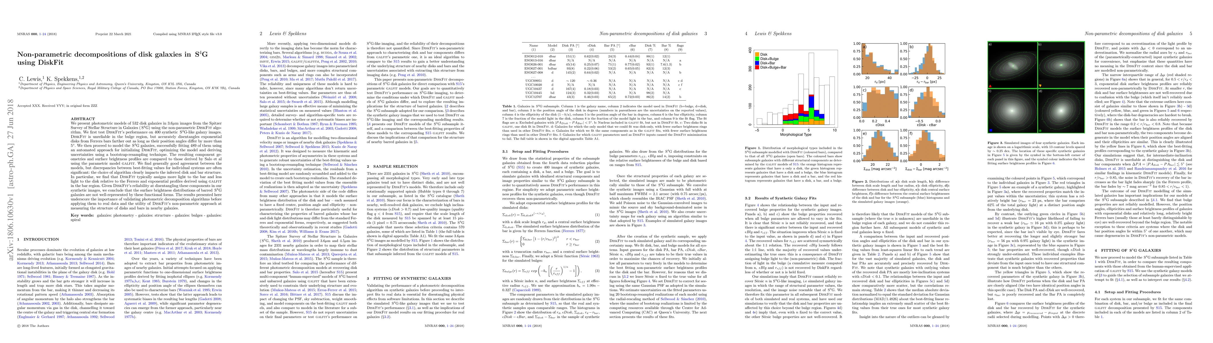 The research employs the DiskFit algorithm on 532 disk galaxies from the S$^4$G survey, finding it reliable for separating disks and bars except in bulge regions. Despite good overall agreement with parametric galfit models, DiskFit allocates more bar light and less disk light, suggesting surface brightness distributions of barred galaxies may not follow conventional forms. This study highlights the need for validating decomposition algorithms before real data application and showcases DiskFit's non-parametric approach effectiveness in measuring disk and bar structures in nearby galaxies.