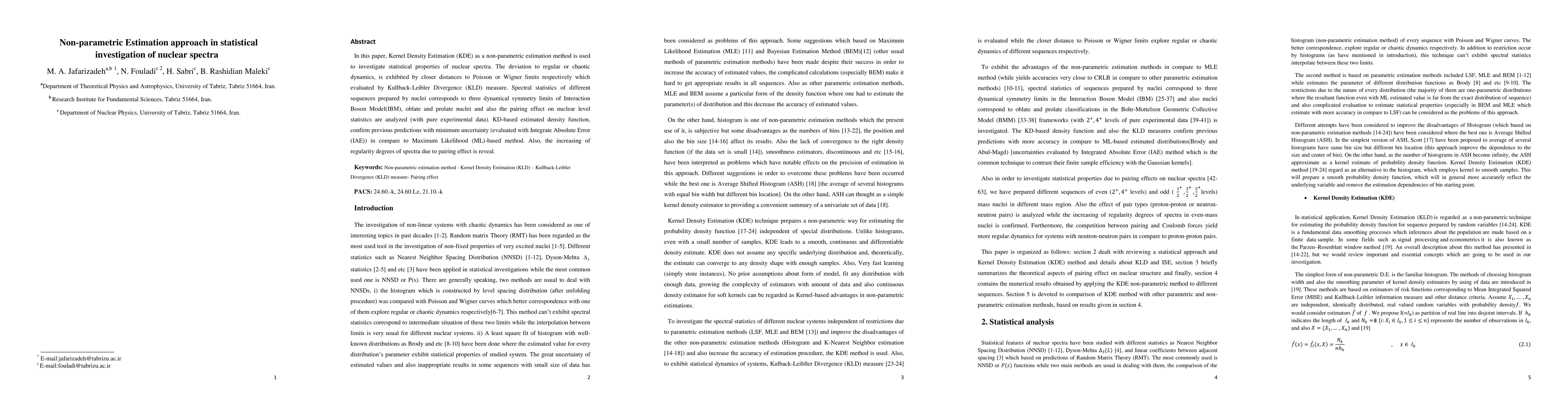 In this paper, Kernel Density Estimation (KDE) as a non-parametric estimation method is used to investigate statistical properties of nuclear spectra. The deviation to regular or chaotic dynamics, is exhibited by closer distances to Poisson or Wigner limits respectively which evaluated by Kullback-Leibler Divergence (KLD) measure. Spectral statistics of different sequences prepared by nuclei corresponds to three dynamical symmetry limits of Interaction Boson Model(IBM), oblate and prolate nuclei and also the pairing effect on nuclear level statistics are analyzed (with pure experimental data). KD-based estimated density function, confirm previous predictions with minimum uncertainty (evaluated with Integrate Absolute Error (IAE)) in compare to Maximum Likelihood (ML)-based method. Also, the increasing of regularity degrees of spectra due to pairing effect is reveal.