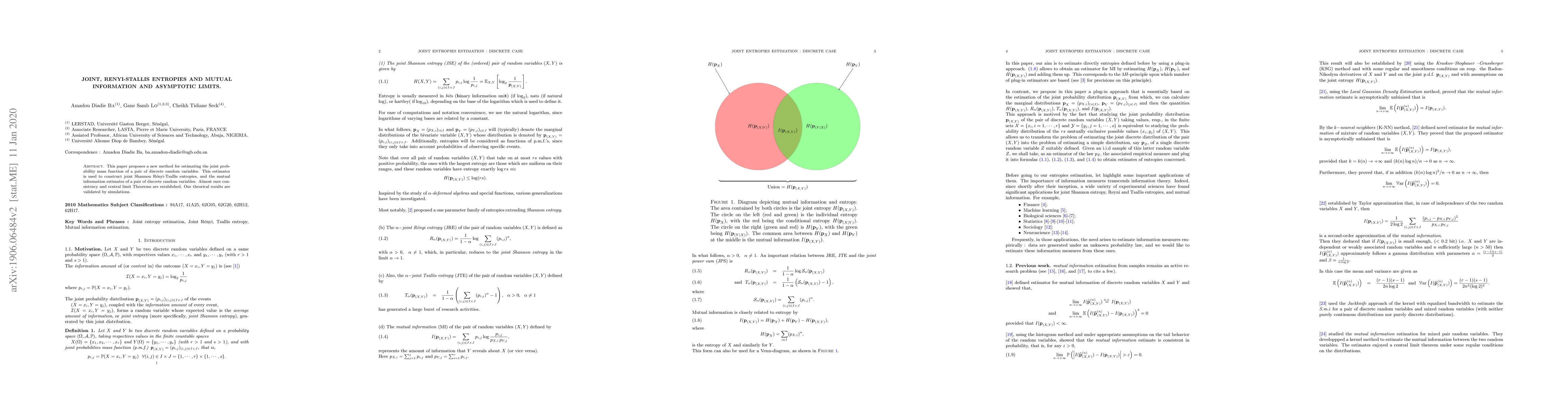This paper introduces a novel method for estimating the joint probability mass function of discrete random variables, using it to compute joint Shannon Rényi-Tsallis entropies and mutual information. Theoretical results, including almost sure consistency and central limit theorems, are validated through simulations.