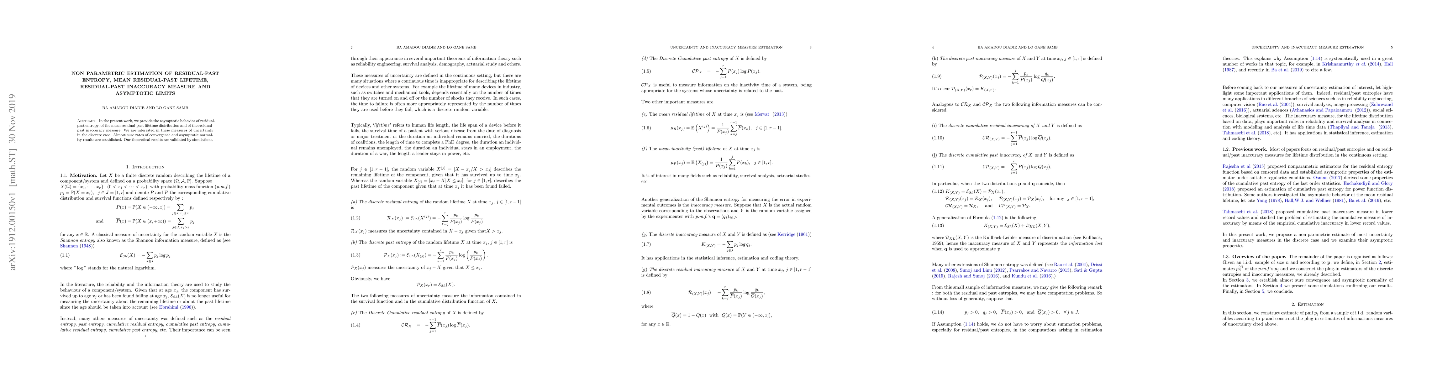 This paper investigates non-parametric estimation methods for residual-past entropy, mean residual-past lifetime, and residual-past inaccuracy measure in the discrete case, establishing almost sure convergence rates and asymptotic normality. Simulation results validate the theoretical findings.