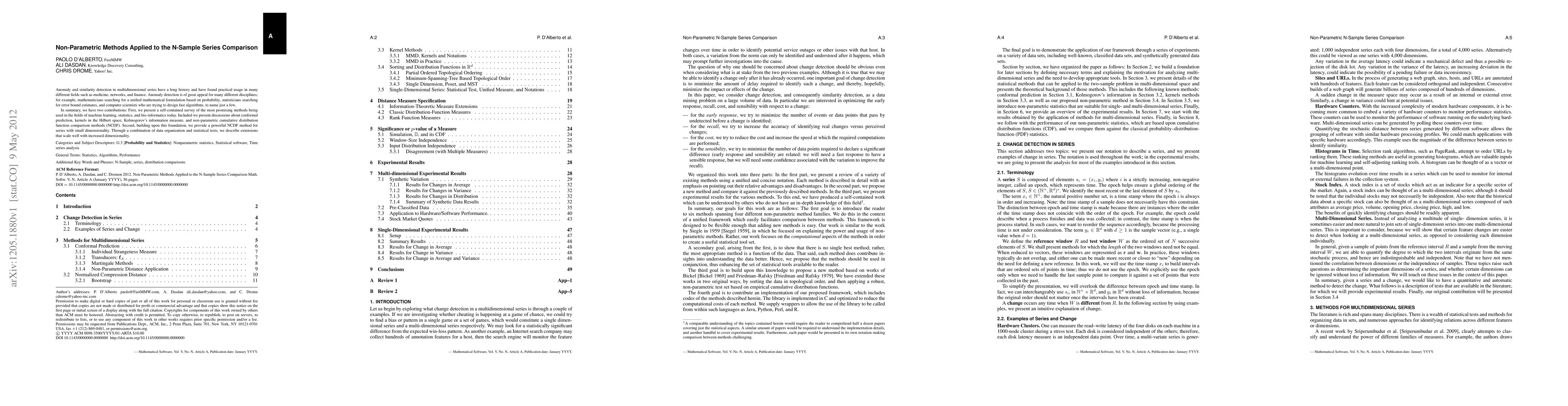 Anomaly and similarity detection in multidimensional series have a long history and have found practical usage in many different fields such as medicine, networks, and finance. Anomaly detection is of great appeal for many different disciplines; for example, mathematicians searching for a unified mathematical formulation based on probability, statisticians searching for error bound estimates, and computer scientists who are trying to design fast algorithms, to name just a few. In summary, we have two contributions: First, we present a self-contained survey of the most promising methods being used in the fields of machine learning, statistics, and bio-informatics today. Included we present discussions about conformal prediction, kernels in the Hilbert space, Kolmogorov's information measure, and non-parametric cumulative distribution function comparison methods (NCDF). Second, building upon this foundation, we provide a powerful NCDF method for series with small dimensionality. Through a combination of data organization and statistical tests, we describe extensions that scale well with increased dimensionality.