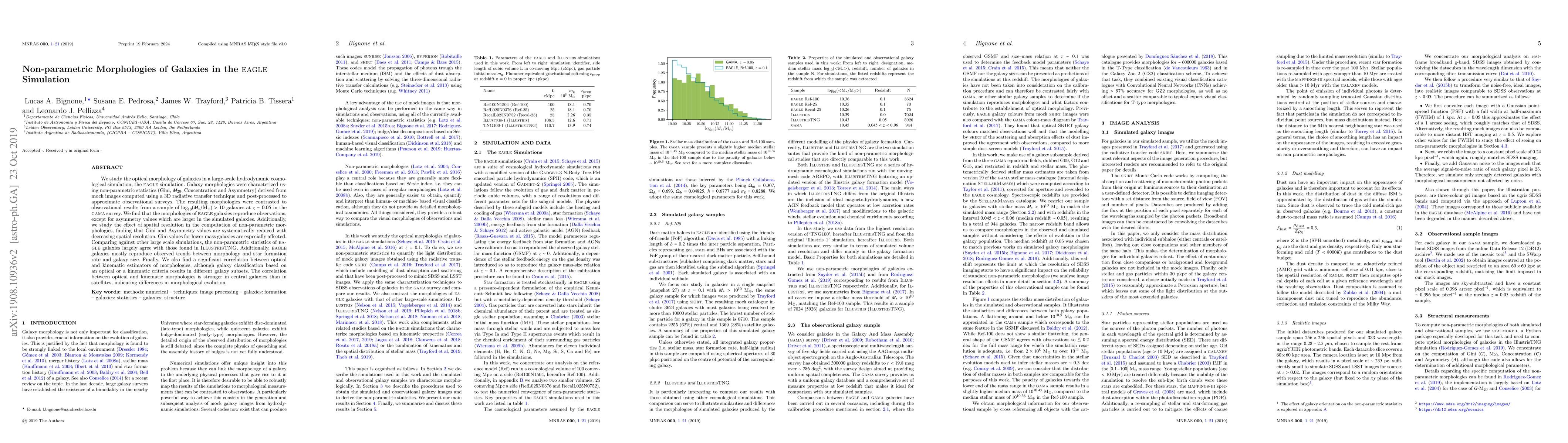 This paper examines the optical morphologies of galaxies in the EAGLE simulation using non-parametric statistics, finding good agreement with observations, except for larger asymmetry in simulated galaxies. It also highlights the impact of spatial resolution on these statistics, with lower resolution reducing Gini and Asymmetry values.