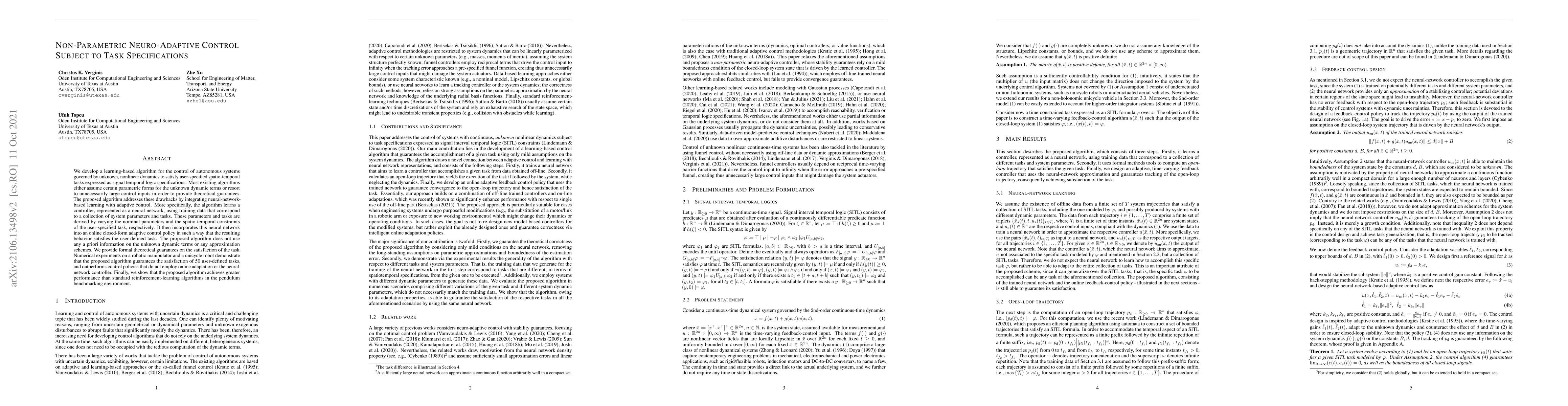 We develop a learning-based algorithm for the control of autonomous systems governed by unknown, nonlinear dynamics to satisfy user-specified spatio-temporal tasks expressed as signal temporal logic specifications. Most existing algorithms either assume certain parametric forms for the unknown dynamic terms or resort to unnecessarily large control inputs in order to provide theoretical guarantees. The proposed algorithm addresses these drawbacks by integrating neural-network-based learning with adaptive control. More specifically, the algorithm learns a controller, represented as a neural network, using training data that correspond to a collection of system parameters and tasks. These parameters and tasks are derived by varying the nominal parameters and the spatio-temporal constraints of the user-specified task, respectively. It then incorporates this neural network into an online closed-form adaptive control policy in such a way that the resulting behavior satisfies the user-defined task. The proposed algorithm does not use any a priori information on the unknown dynamic terms or any approximation schemes. We provide formal theoretical guarantees on the satisfaction of the task. Numerical experiments on a robotic manipulator and a unicycle robot demonstrate that the proposed algorithm guarantees the satisfaction of 50 user-defined tasks, and outperforms control policies that do not employ online adaptation or the neural-network controller. Finally, we show that the proposed algorithm achieves greater performance than standard reinforcement-learning algorithms in the pendulum benchmarking environment.