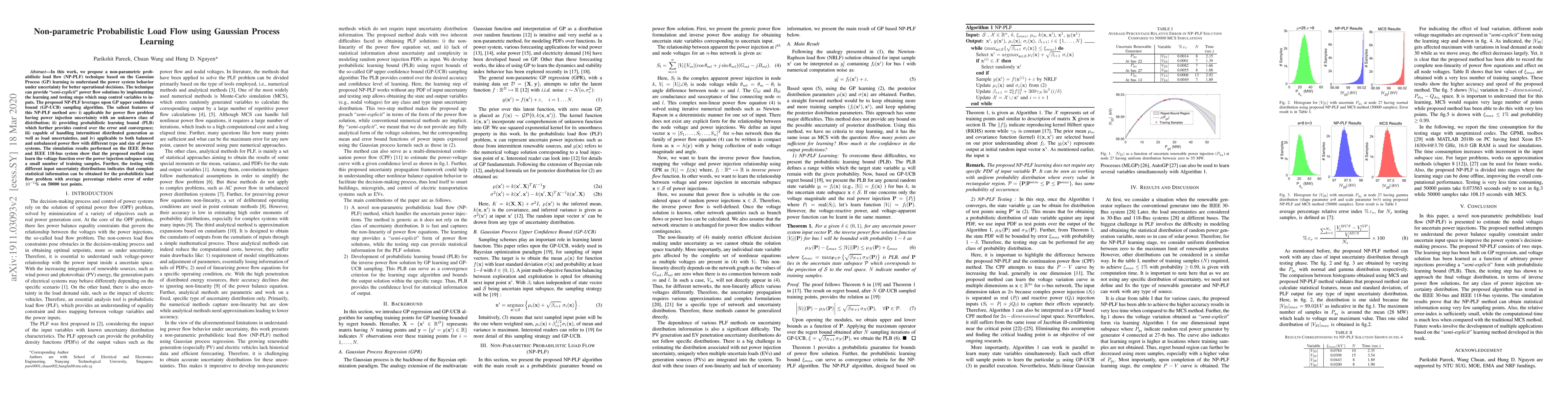 In this work, we propose a non-parametric probabilistic load flow (NP-PLF) technique based on the Gaussian Process (GP) learning to understand the power system behavior under uncertainty for better operational decisions. The technique can provide "semi-explicit" power flow solutions by implementing the learning and testing steps which map control variables to inputs. The proposed NP-PLF leverages upon GP upper confidence bound (GP-UCB) sampling algorithm. The salient features of this NP-PLF method are: i) applicable for power flow problem having power injection uncertainty with an unknown class of distribution; ii) providing probabilistic learning bound (PLB) which further provides control over the error and convergence; iii) capable of handling intermittent distributed generation as well as load uncertainties, and iv) applicable to both balanced and unbalanced power flow with different type and size of power systems. The simulation results performed on the IEEE 30-bus and IEEE 118-bus system show that the proposed method can learn the voltage function over the power injection subspace using a small number of training samples. Further, the testing with different input uncertainty distributions indicates that complete statistical information can be obtained for the probabilistic load flow problem with average percentage relative error of order $10^{-3}$\% on 50000 test points.