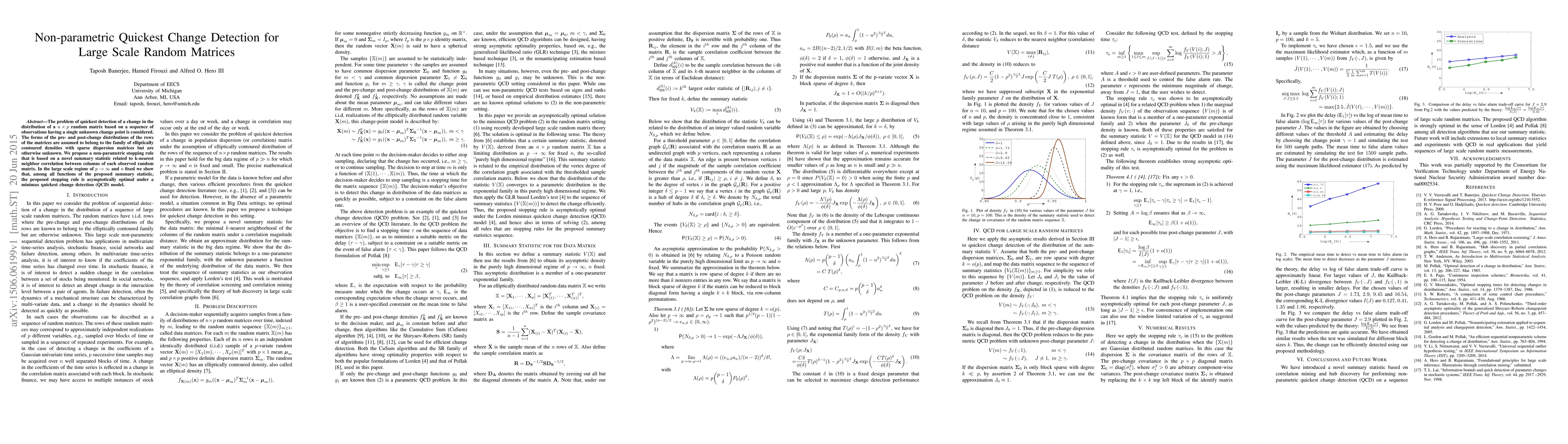 This paper proposes a non-parametric method for detecting changes in the distribution of large-scale random matrices, using a novel k-nearest neighbor correlation statistic. The method is shown to be asymptotically optimal in the large dimension regime, under a minimax quickest change detection framework.