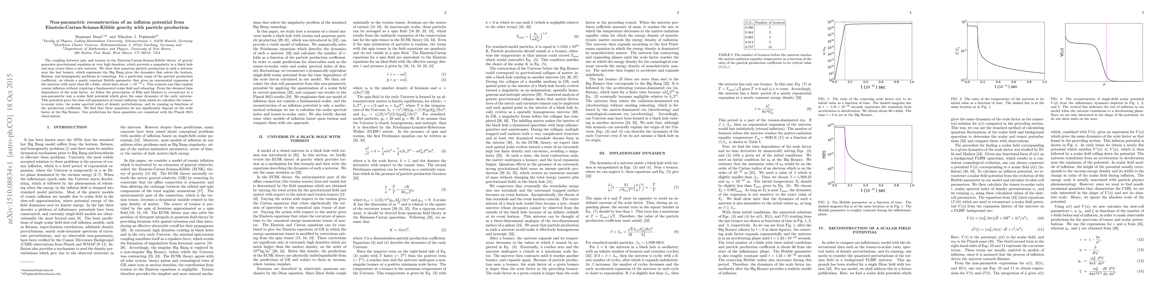 This paper proposes a non-parametric reconstruction of an inflaton potential from Einstein-Cartan-Sciama-Kibble gravity, showing that quantum particle production near the last bounce can solve cosmological problems without a fundamental scalar field. The model predicts quantities consistent with Planck 2015 observations, suggesting an alternative to traditional inflationary scenarios.