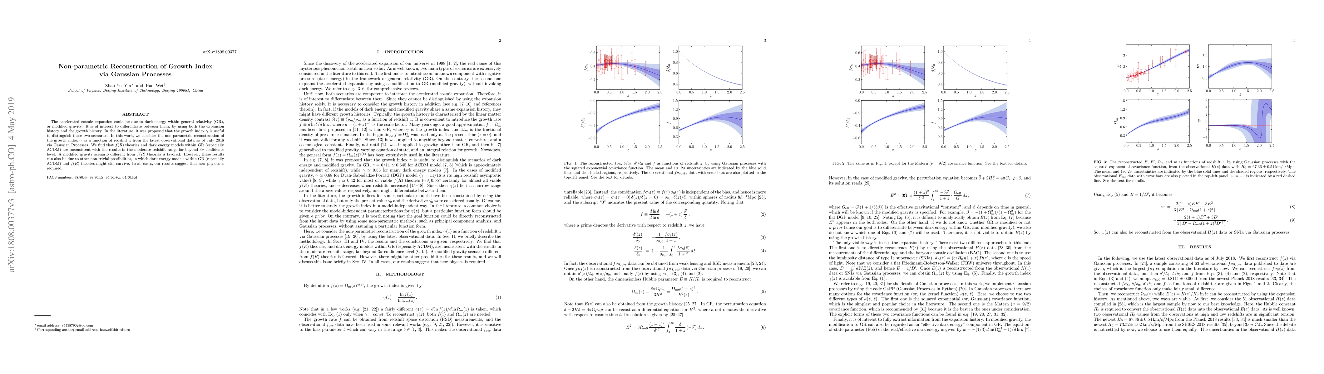 The accelerated cosmic expansion could be due to dark energy within general relativity (GR), or modified gravity. It is of interest to differentiate between them, by using both the expansion history and the growth history. In the literature, it was proposed that the growth index $\gamma$ is useful to distinguish these two scenarios. In this work, we consider the non-parametric reconstruction of the growth index $\gamma$ as a function of redshift $z$ from the latest observational data as of July 2018 via Gaussian Processes. We find that $f(R)$ theories and dark energy models within GR (especially $\Lambda$CDM) are inconsistent with the results in the moderate redshift range far beyond $3\sigma$ confidence level. A modified gravity scenario different from $f(R)$ theories is favored. However, these results can also be due to other non-trivial possibilities, in which dark energy models within GR (especially $\Lambda$CDM) and $f(R)$ theories might still survive. In all cases, our results suggest that new physics is required.