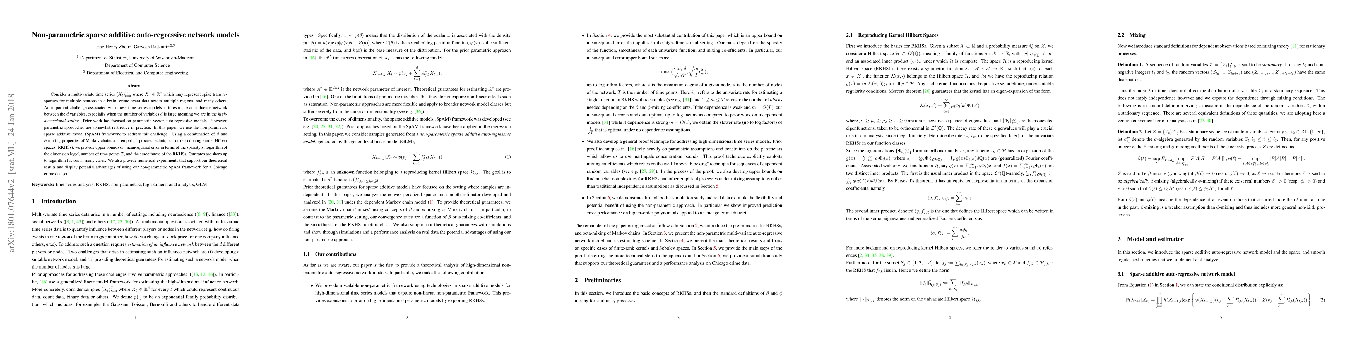Consider a multi-variate time series $(X_t)_{t=0}^{T}$ where $X_t \in \mathbb{R}^d$ which may represent spike train responses for multiple neurons in a brain, crime event data across multiple regions, and many others. An important challenge associated with these time series models is to estimate an influence network between the $d$ variables, especially when the number of variables $d$ is large meaning we are in the high-dimensional setting. Prior work has focused on parametric vector auto-regressive models. However, parametric approaches are somewhat restrictive in practice. In this paper, we use the non-parametric sparse additive model (SpAM) framework to address this challenge. Using a combination of $\beta$ and $\phi$-mixing properties of Markov chains and empirical process techniques for reproducing kernel Hilbert spaces (RKHSs), we provide upper bounds on mean-squared error in terms of the sparsity $s$, logarithm of the dimension $\log d$, number of time points $T$, and the smoothness of the RKHSs. Our rates are sharp up to logarithm factors in many cases. We also provide numerical experiments that support our theoretical results and display potential advantages of using our non-parametric SpAM framework for a Chicago crime dataset.
