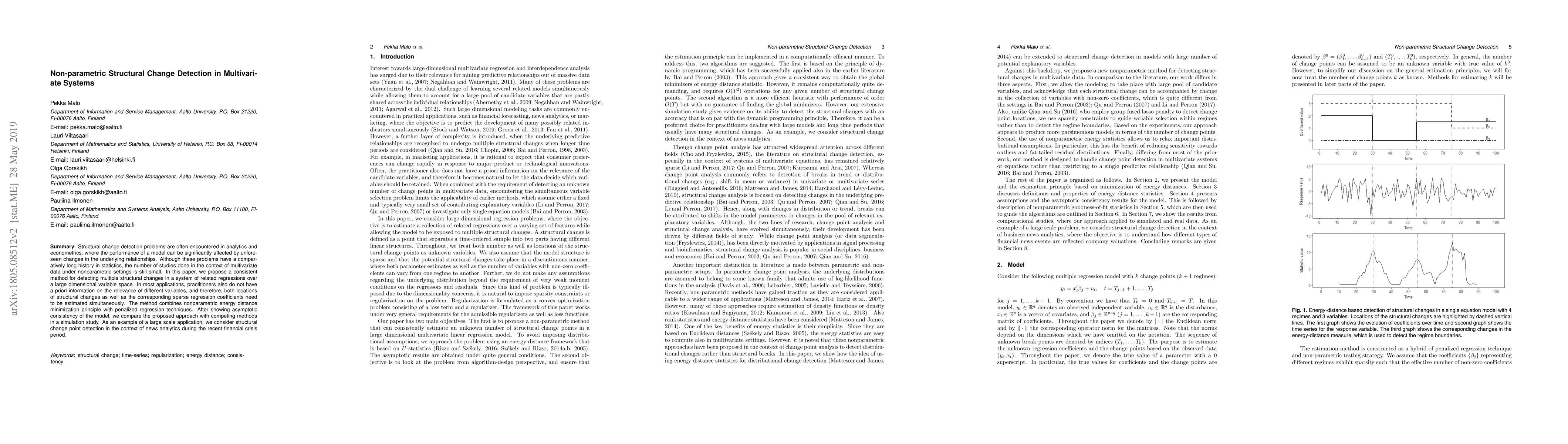 Structural change detection problems are often encountered in analytics and econometrics, where the performance of a model can be significantly affected by unforeseen changes in the underlying relationships. Although these problems have a comparatively long history in statistics, the number of studies done in the context of multivariate data under nonparametric settings is still small. In this paper, we propose a consistent method for detecting multiple structural changes in a system of related regressions over a large dimensional variable space. In most applications, practitioners also do not have a priori information on the relevance of different variables, and therefore, both locations of structural changes as well as the corresponding sparse regression coefficients need to be estimated simultaneously. The method combines nonparametric energy distance minimization principle with penalized regression techniques. After showing asymptotic consistency of the model, we compare the proposed approach with competing methods in a simulation study. As an example of a large scale application, we consider structural change point detection in the context of news analytics during the recent financial crisis period.
