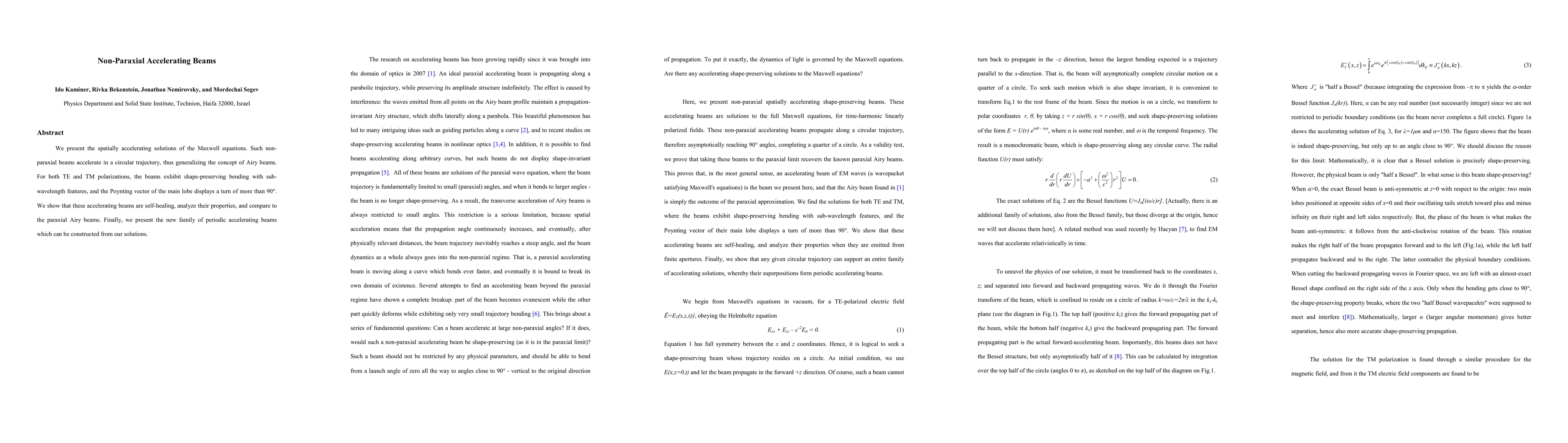 The paper introduces spatially accelerating beams that generalize Airy beams by bending in circular trajectories while preserving shape and sub-wavelength features, exhibiting self-healing properties and a Poynting vector turn of over 90 degrees, and presents a new family of periodic accelerating beams.