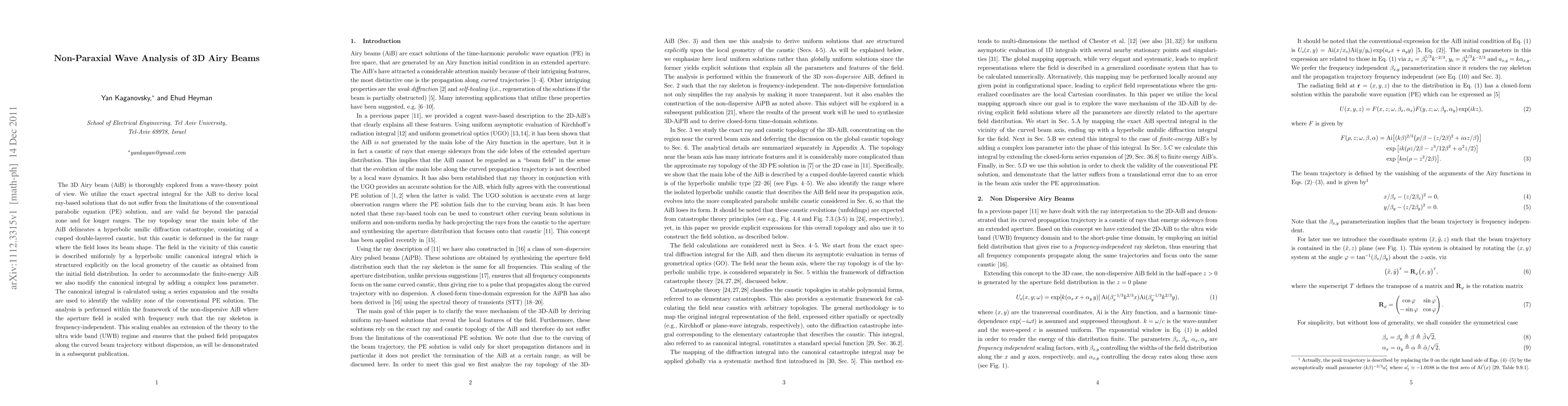 This research investigates the 3D Airy beam using non-paraxial wave theory, deriving local ray-based solutions beyond conventional parabolic equation limitations. It employs a hyperbolic umilic canonical integral to describe the field near the caustic, modified with a complex loss parameter to accommodate finite-energy beams, and extends the analysis to ultra wide band regimes without dispersion.
