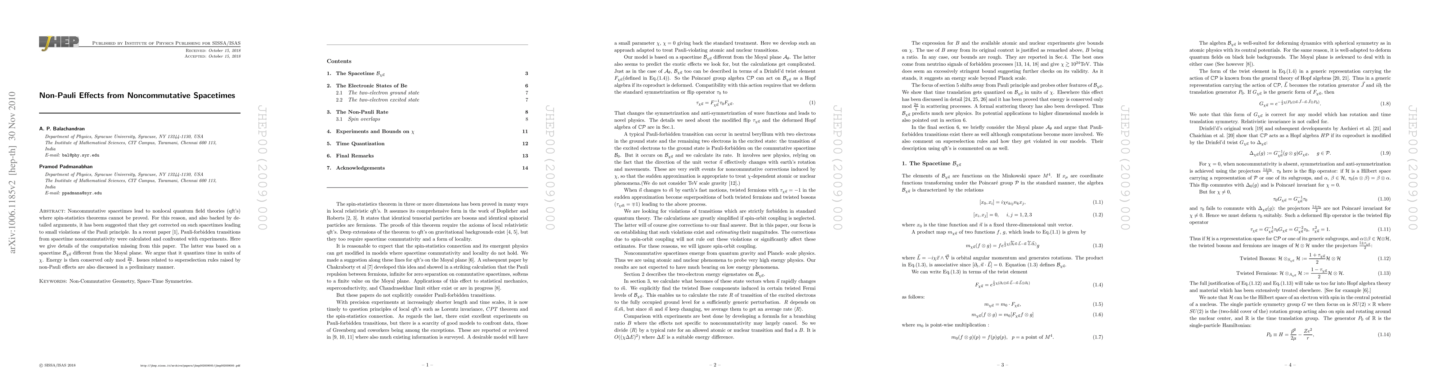Noncommutative spacetimes lead to nonlocal quantum field theories (qft's) where spin-statistics theorems cannot be proved. For this reason, and also backed by detailed arguments, it has been suggested that they get corrected on such spacetimes leading to small violations of the Pauli principle. In a recent paper \cite{Pauli}, Pauli-forbidden transitions from spacetime noncommutativity were calculated and confronted with experiments. Here we give details of the computation missing from this paper. The latter was based on a spacetime $\mathcal{B}_{\chi\vec{n}}$ different from the Moyal plane. We argue that it quantizes time in units of $\chi$. Energy is then conserved only mod $\frac{2\pi}{\chi}$. Issues related to superselection rules raised by non-Pauli effects are also discussed in a preliminary manner.