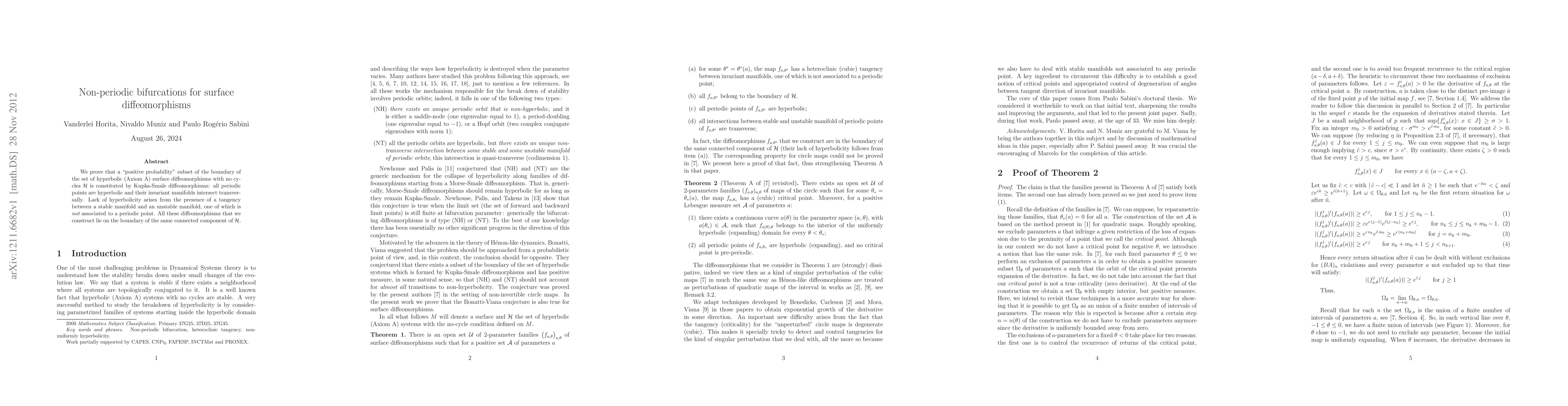 We prove that a "positive probability" subset of the boundary of the set of hyperbolic (Axiom A) surface diffeomorphisms with no cycles $\mathcal{H}$ is constituted by Kupka-Smale diffeomorphisms: all periodic points are hyperbolic and their invariant manifolds intersect transversally. Lack of hyperbolicity arises from the presence of a tangency between a stable manifold and an unstable manifold, one of which is not associated to a periodic point. All these diffeomorphisms that we construct lie on the boundary of the same connected component of $\mathcal{H}$.