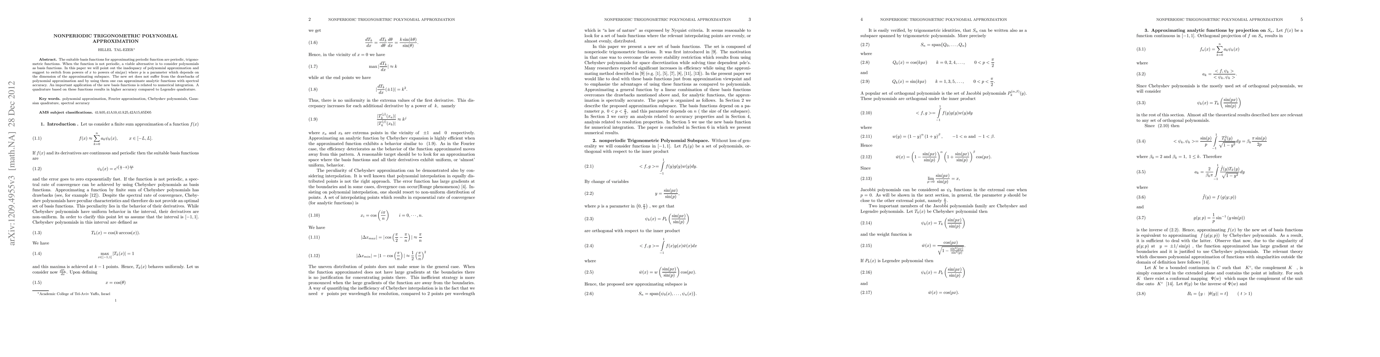 The suitable basis functions for approximating periodic function are periodic, trigonometric functions. When the function is not periodic, a viable alternative is to consider polynomials as basis functions. In this paper we will point out the inadequacy of polynomial approximation and suggest to switch from powers of $x$ to powers of $\sin(px)$ where $p$ is a parameter which depends on the dimension of the approximating subspace. The new set does not suffer from the drawbacks of polynomial approximation and by using them one can approximate analytic functions with spectral accuracy. An important application of the new basis functions is related to numerical integration. A quadrature based on these functions results in higher accuracy compared to Legendre quadrature.