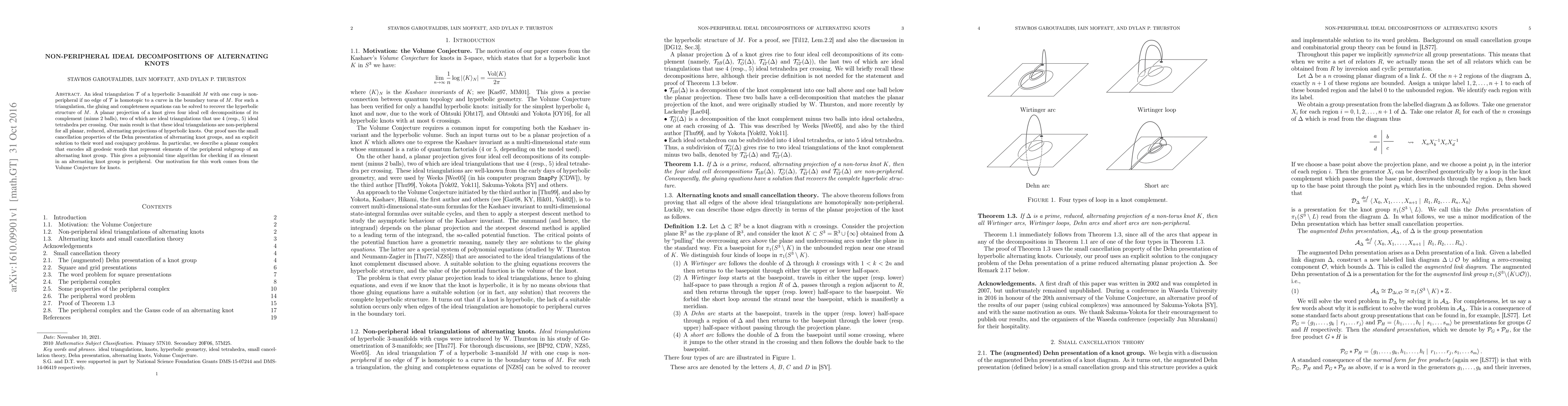 This paper demonstrates that ideal triangulations derived from planar, reduced, alternating projections of hyperbolic knots are non-peripheral, using small cancellation properties and solving word and conjugacy problems for alternating knot groups. This result supports the Volume Conjecture for knots.