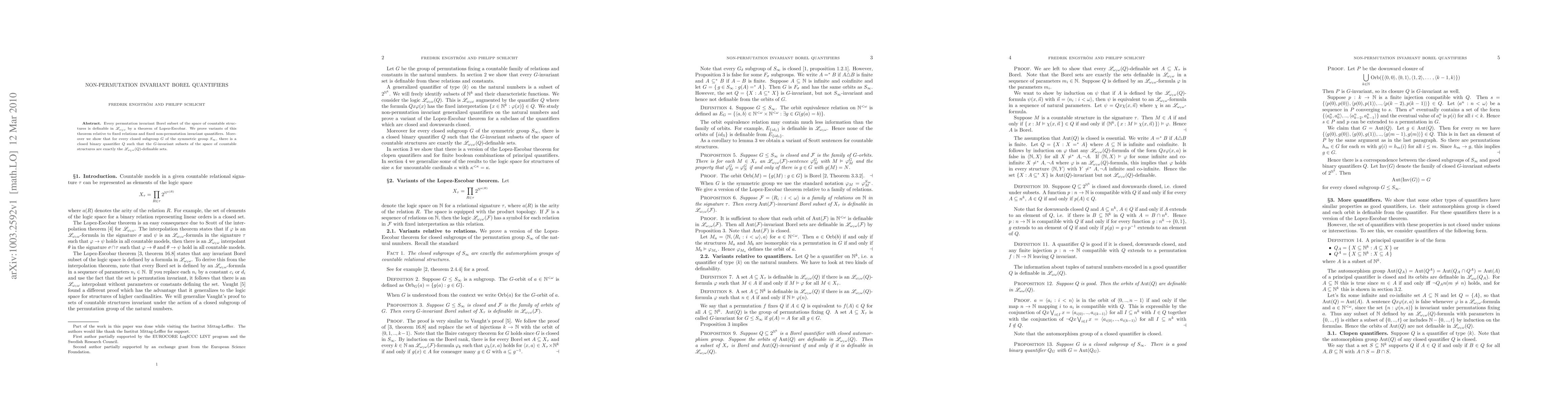 Every permutation invariant Borel subset of the space of countable structures is definable in $\La_{\omega_1\omega}$ by a theorem of Lopez-Escobar. We prove variants of this theorem relative to fixed relations and fixed non-permutation invariant quantifiers. Moreover we show that for every closed subgroup $G$ of the symmetric group $S_{\infty}$, there is a closed binary quantifier $Q$ such that the $G$-invariant subsets of the space of countable structures are exactly the $\La_{\omega_1\omega}(Q)$-definable sets.