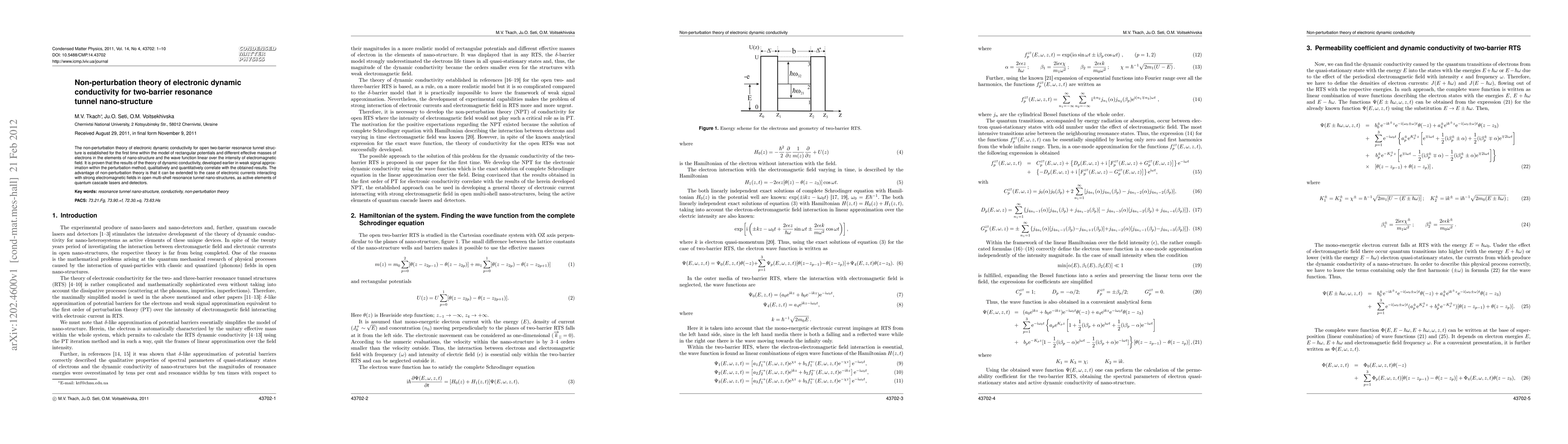 This paper establishes a non-perturbation theory for electronic dynamic conductivity in two-barrier resonance tunnel nano-structures, demonstrating its applicability to strong electromagnetic fields and validating its results against perturbation methods. The theory extends to multi-shell nano-structures, making it relevant for quantum cascade lasers and detectors.