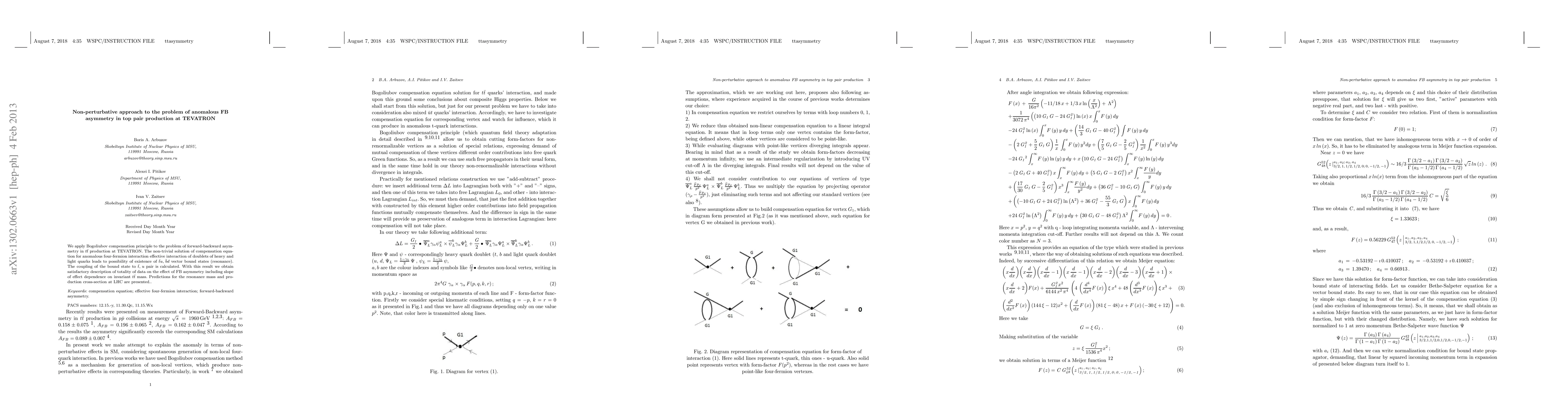 We apply Bogoliubov compensation principle to the problem of forward-backward asymmetry in $t \bar t$ production at TEVATRON. The non-trivial solution of compensation equation for anomalous four-fermion interaction effective interaction of doublets of heavy and light quarks leads to possibility of existence of $\bar t u,\, \bar b d$ vector bound states (resonance). The coupling of the bound state to $\bar t,\,u$ pair is calculated. With this result we obtain satisfactory description of totality of data on the effect of FB asymmetry including slope of effect dependence on invariant $t \bar t$ mass. Predictions for the resonance mass and production cross-section at LHC are presented.