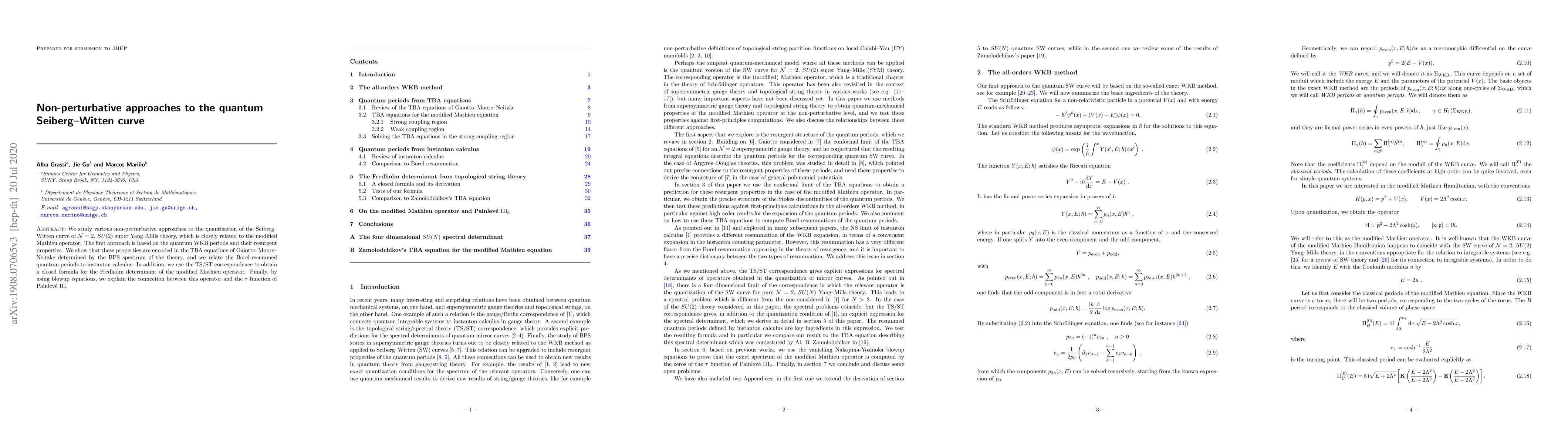 This paper explores non-perturbative methods for quantizing the Seiberg-Witten curve in ${\cal N}=2$, $SU(2)$ super Yang-Mills theory, linking it to the modified Mathieu operator. It employs quantum WKB periods and their resurgent properties, relating them to the BPS spectrum and instanton calculus via the TBA equations, and uses the TS/ST correspondence to derive a closed formula for the Fredholm determinant.