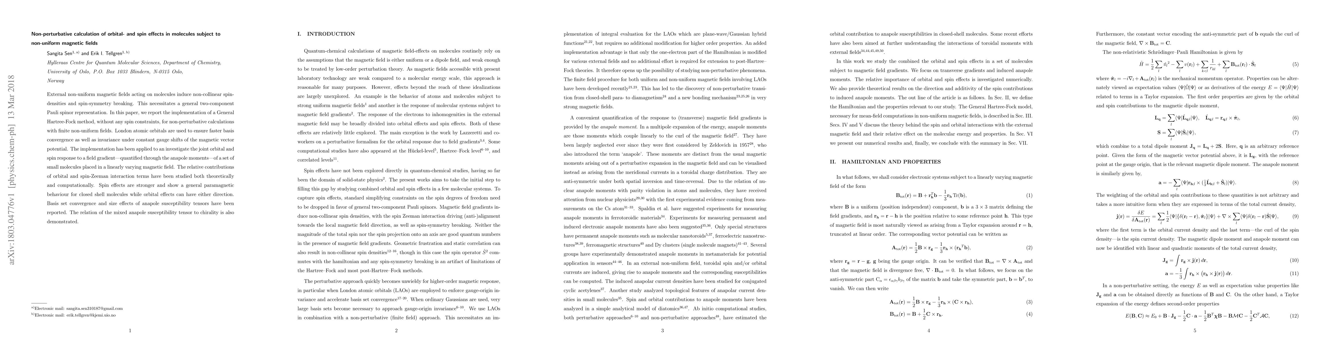 This paper presents a non-perturbative General Hartree-Fock method for calculating orbital and spin effects in molecules under non-uniform magnetic fields, using London atomic orbitals for efficient convergence. It investigates the anapole moments and relative contributions of orbital and spin-Zeeman interactions in small molecules, highlighting the stronger paramagnetic spin effects.
