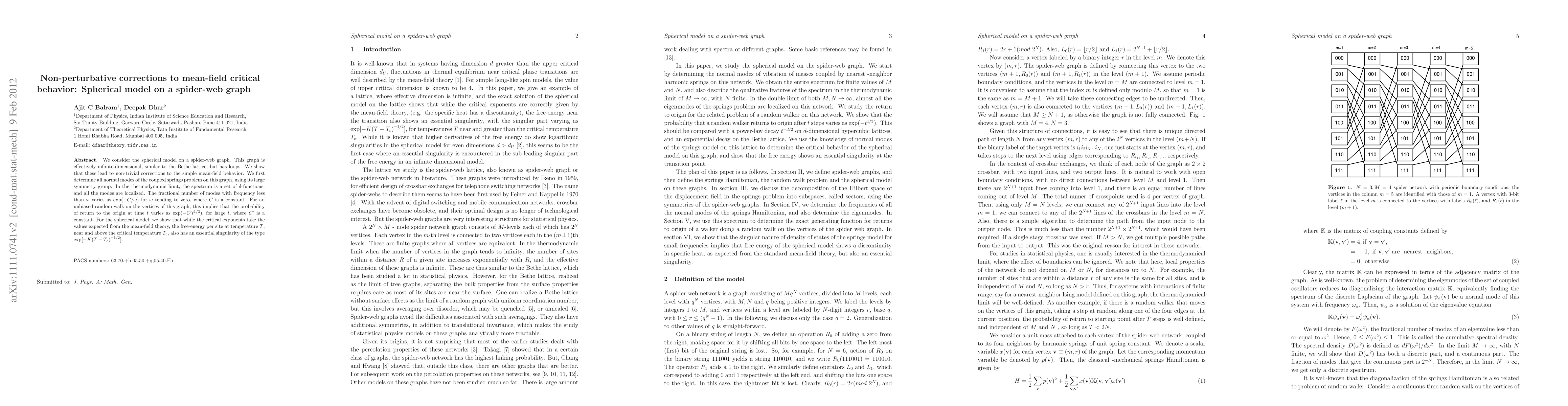We consider the spherical model on a spider-web graph. This graph is effectively infinite-dimensional, similar to the Bethe lattice, but has loops. We show that these lead to non-trivial corrections to the simple mean-field behavior. We first determine all normal modes of the coupled springs problem on this graph, using its large symmetry group. In the thermodynamic limit, the spectrum is a set of $\delta$-functions, and all the modes are localized. The fractional number of modes with frequency less than $\omega$ varies as $\exp (-C/\omega)$ for $\omega$ tending to zero, where $C$ is a constant. For an unbiased random walk on the vertices of this graph, this implies that the probability of return to the origin at time $t$ varies as $\exp(- C' t^{1/3})$, for large $t$, where $C'$ is a constant. For the spherical model, we show that while the critical exponents take the values expected from the mean-field theory, the free-energy per site at temperature $T$, near and above the critical temperature $T_c$, also has an essential singularity of the type $\exp[ -K {(T - T_c)}^{-1/2}]$.