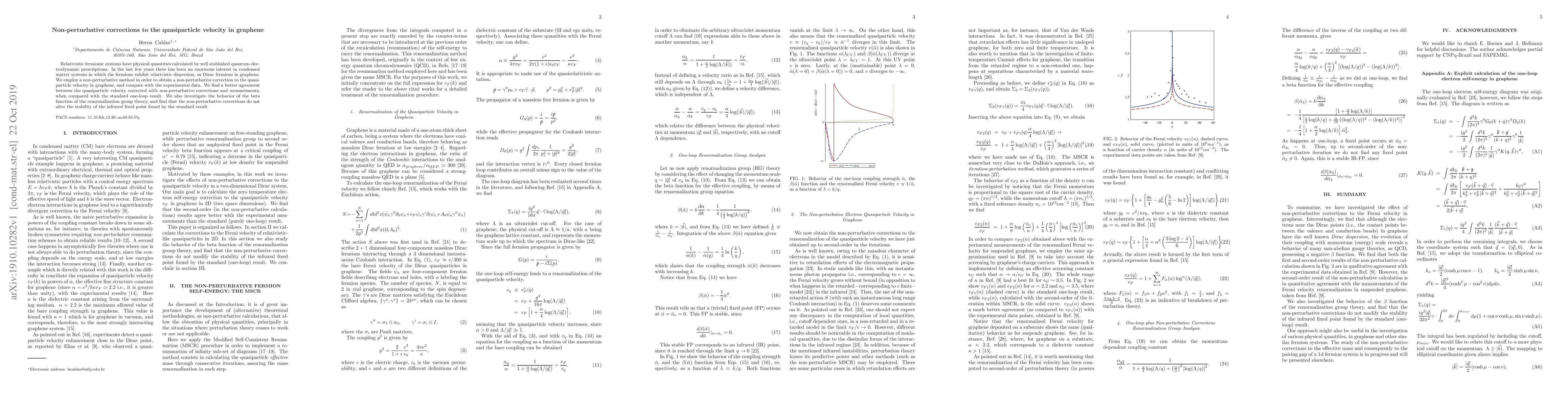 Relativistic fermionic systems have physical quantities calculated by well stablished quantum electrodynamic prescriptions. In the last few years there has been an enormous interest in condensed matter systems in which the fermions exhibit relativistic dispersion, as Dirac fermions in graphene. We employ a non-perturbative method in order to obtain a non-perturbative correction to the quasiparticle velocity in graphene, and compare with the experimental data. We find a better agreement between the quasiparticle velocity corrected with non-perturbative corrections and measurements, when compared with the standard one-loop result. We also investigate the behavior of the beta function of the renormalization group theory, and find that the non-perturbative corrections do not alter the stability of the infrared fixed point found by the standard result.