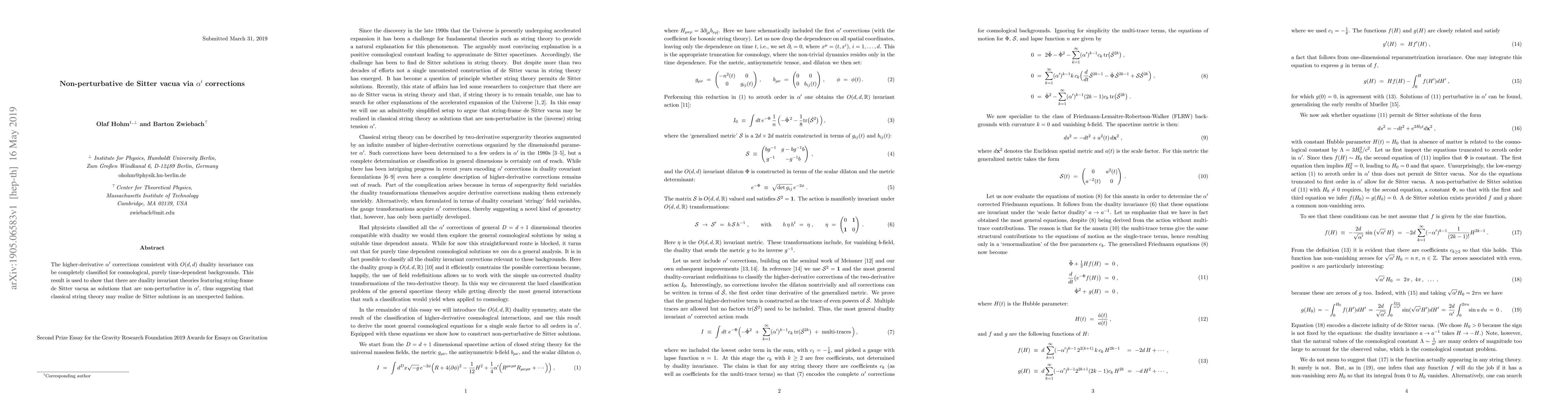 Summary: This paper classifies higher-derivative $\alpha'$ corrections preserving $O(d,d)$ duality for cosmological backgrounds and demonstrates the existence of duality invariant theories with non-perturbative string-frame de Sitter vacua, indicating classical string theory's potential for unexpected de Sitter solutions.