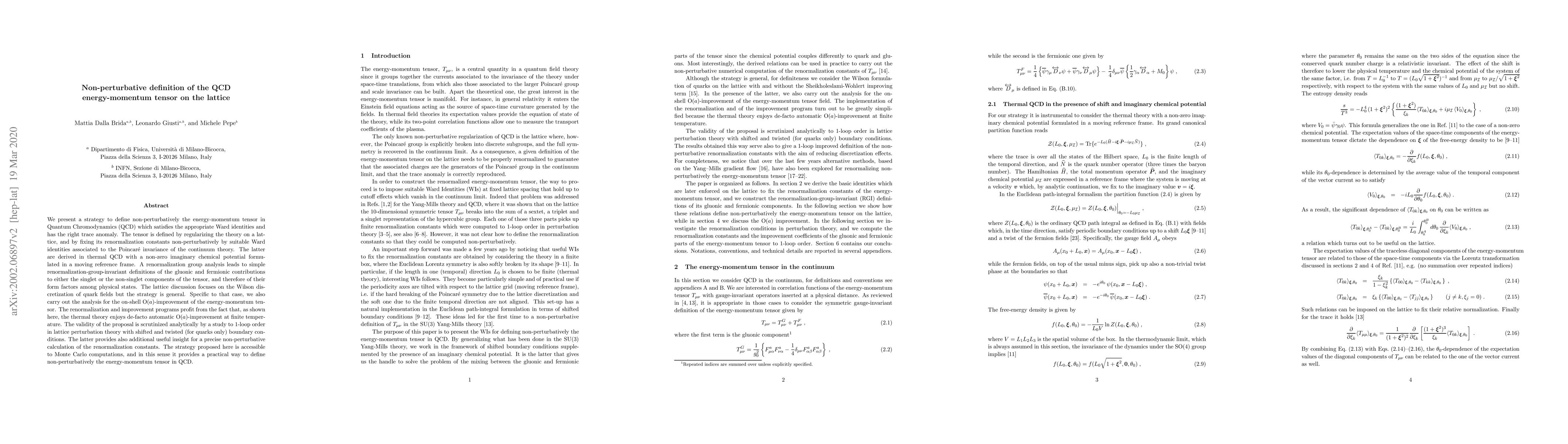 We present a strategy to define non-perturbatively the energy-momentum tensor in Quantum Chromodynamics (QCD) which satisfies the appropriate Ward identities and has the right trace anomaly. The tensor is defined by regularizing the theory on a lattice, and by fixing its renormalization constants non-perturbatively by suitable Ward identities associated to the Poincare' invariance of the continuum theory. The latter are derived in thermal QCD with a non-zero imaginary chemical potential formulated in a moving reference frame. A renormalization group analysis leads to simple renormalization-group-invariant definitions of the gluonic and fermionic contributions to either the singlet or the non-singlet components of the tensor, and therefore of their form factors among physical states. The lattice discussion focuses on the Wilson discretization of quark fields but the strategy is general. Specific to that case, we also carry out the analysis for the on-shell O(a)-improvement of the energy-momentum tensor. The renormalization and improvement programs profit from the fact that, as shown here, the thermal theory enjoys de-facto automatic O(a)-improvement at finite temperature. The validity of the proposal is scrutinized analytically by a study to 1-loop order in lattice perturbation theory with shifted and twisted (for quarks only) boundary conditions. The latter provides also additional useful insight for a precise non-perturbative calculation of the renormalization constants. The strategy proposed here is accessible to Monte Carlo computations, and in this sense it provides a practical way to define non-perturbatively the energy-momentum tensor in QCD.