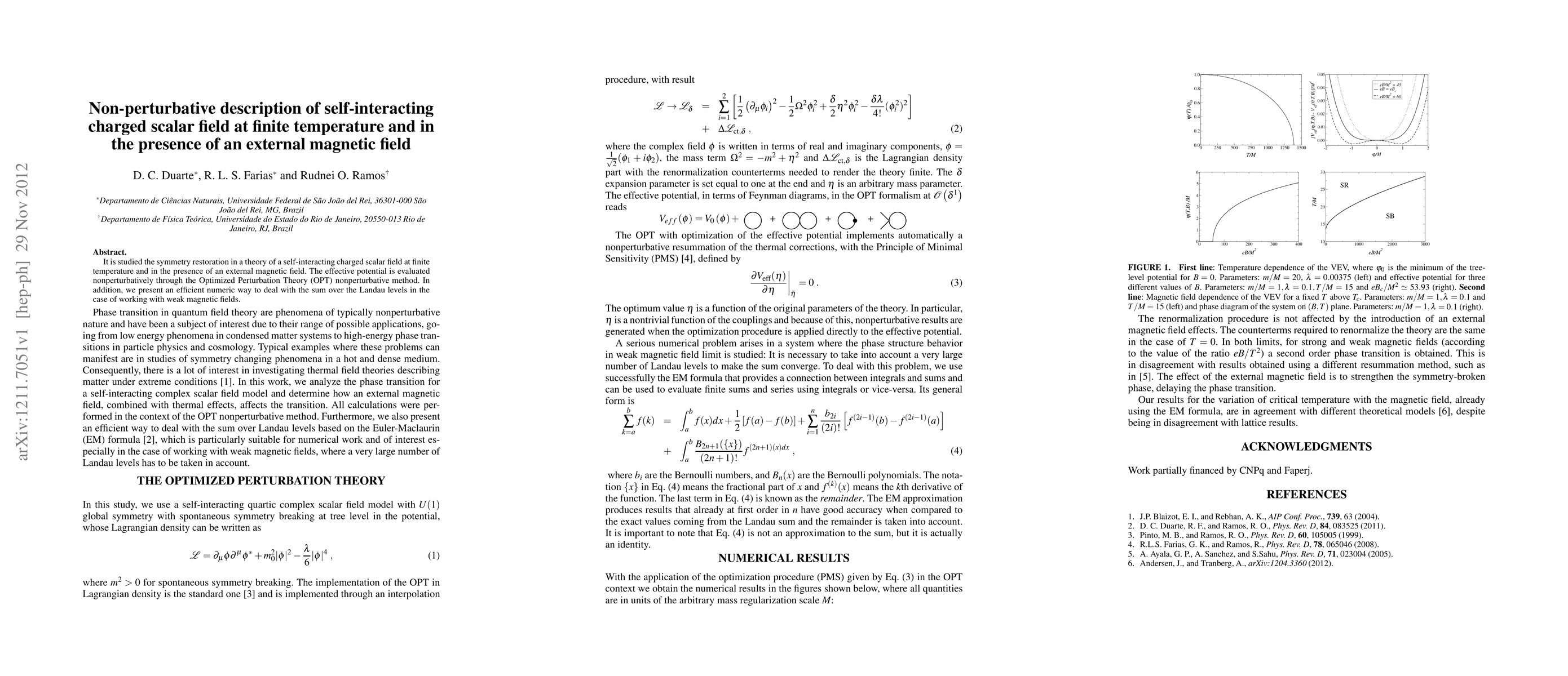 This paper investigates symmetry restoration in a self-interacting charged scalar field at finite temperature and under an external magnetic field using Optimized Perturbation Theory. It also presents a numerical method for efficiently handling the sum over Landau levels in weak magnetic fields.