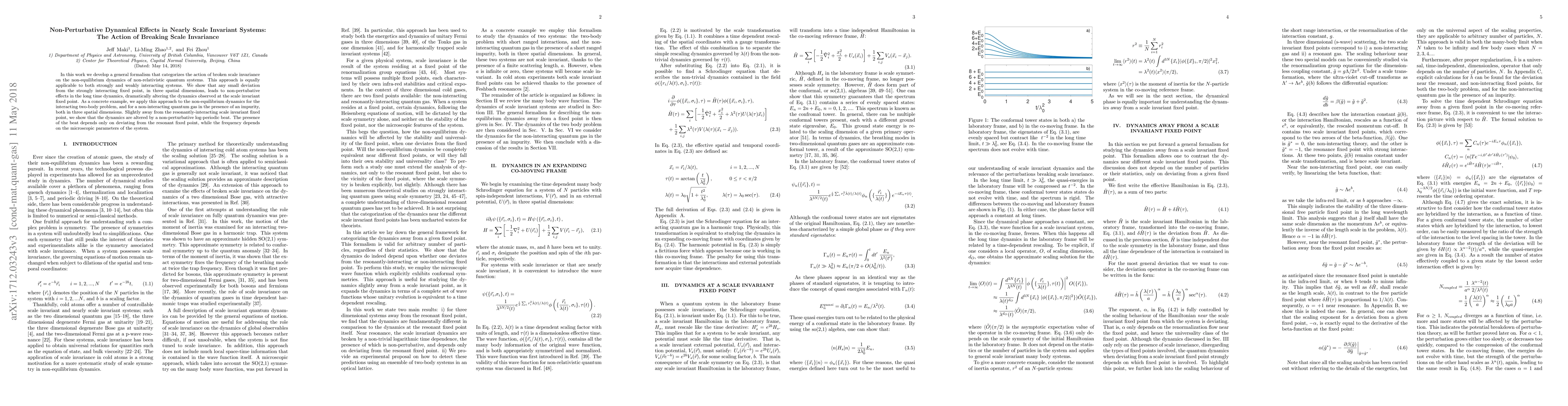 In this work we develop a general formalism that categorizes the action of broken scale invariance on the non-equilibrium dynamics of non-relativistic quantum systems. This approach is equally applicable to both strongly and weakly interacting systems. We show that any small deviation from the strongly interacting fixed point, in three spatial dimensions, leads to non-pertubative effects in the long time dynamics, dramatically altering the dynamics observed at the scale invariant fixed point. As a concrete example, we apply this approach to the non-equilibrium dynamics for the interacting two-body problem, and for a non-interacting quantum gas in the presence of an impurity, both in three spatial dimensions. Slightly away from the resonantly-interacting scale invariant fixed point, we show that the dynamics are altered by a non-perturbative log-periodic beat. The presence of the beat depends only on deviating from the resonant fixed point, while the frequency depends on the microscopic parameters of the system.
