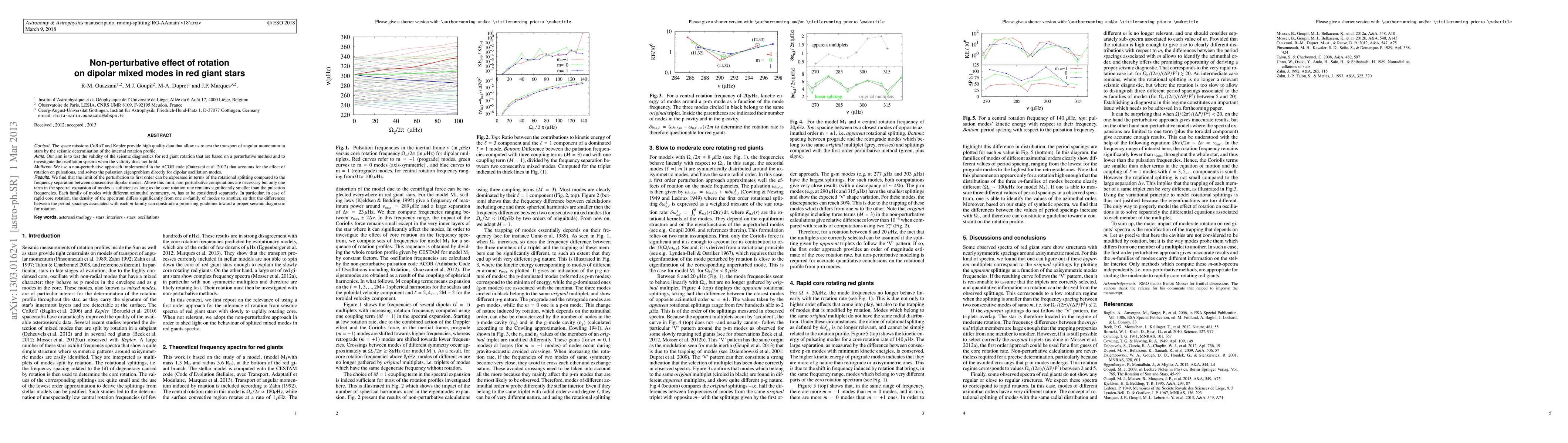The space missions CoRoT and Kepler provide high quality data that allow us to test the transport of angular momentum in stars by the seismic determination of the internal rotation profile. Our aim is to test the validity of the seismic diagnostics for red giants rotation that are based on a perturbative method and to investigate the oscillation spectra when the validity does not hold. We use a non-perturbative approach implemented in the ACOR code (Ouazzani et al. 2012) that accounts for the effect of rotation on pulsations, and solves the pulsation eigenproblem directly for dipolar oscillation modes. We find that the limit of the perturbation to first order can be expressed in terms of the rotational splitting compared to the frequency separation between consecutive dipolar modes. Above this limit, non-perturbative computations are necessary but only one term in the spectral expansion of modes is sufficient as long as the core rotation rate remains significantly smaller than the pulsation frequencies. Each family of modes with different azimuthal symmetry, m, has to be considered separately. In particular, in case of rapid core rotation, the density of the spectrum differs significantly from one m-family of modes to another, so that the differences between the period spacings associated with each m-family can constitute a promising guideline toward a proper seismic diagnostic for rotation.