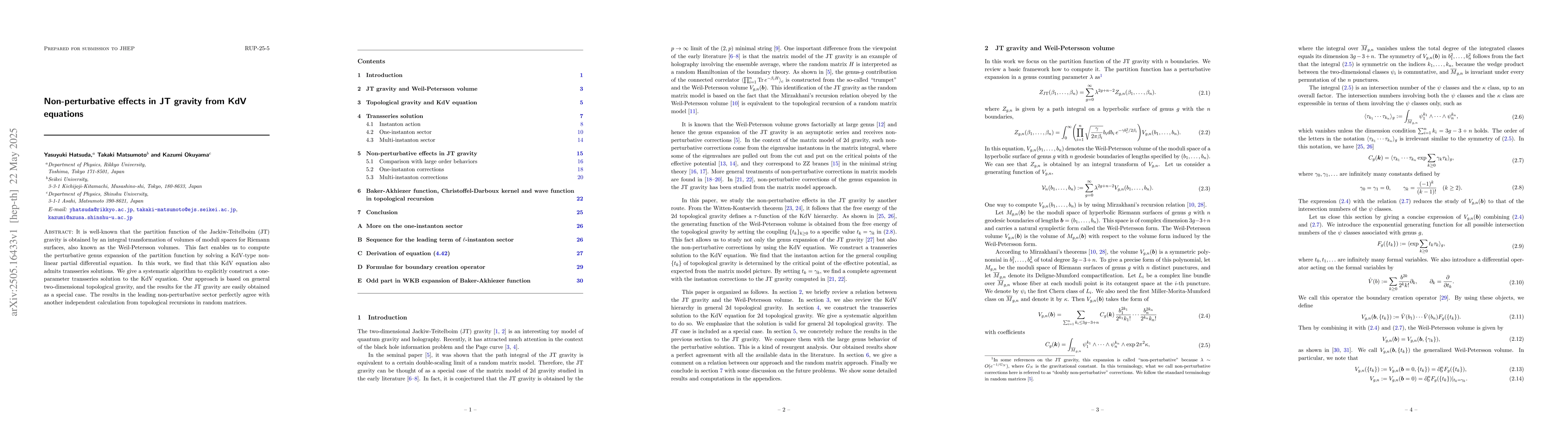 The paper presents an algorithm for constructing transseries solutions to the KdV equation, linking non-perturbative effects in JT gravity to topological gravity.