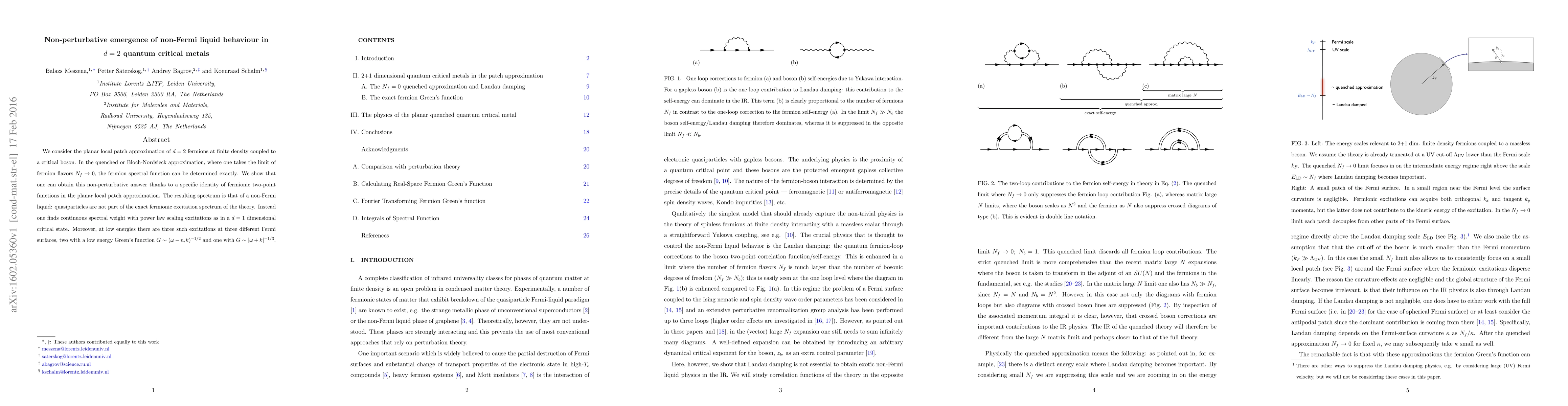 We consider the planar local patch approximation of $d=2$ fermions at finite density coupled to a critical boson. In the quenched or Bloch-Nordsieck approximation, where one takes the limit of fermion flavors $N_f\rightarrow 0$, the fermion spectral function can be determined {exactly}. We show that one can obtain this non-perturbative answer thanks to a specific identity of fermionic two-point functions in the planar local patch approximation. The resulting spectrum is that of a non-Fermi liquid: quasiparticles are not part of the exact fermionic excitation spectrum of the theory. Instead one finds continuous spectral weight with power law scaling excitations as in a $d=1$ dimensional critical state. Moreover, at low energies there are three such excitations at three different Fermi surfaces, two with a low energy Green's function $G \sim (\omega-v_*k)^{-1/2}$ and one with $G \sim |\omega+k|^{-1/3}$.
