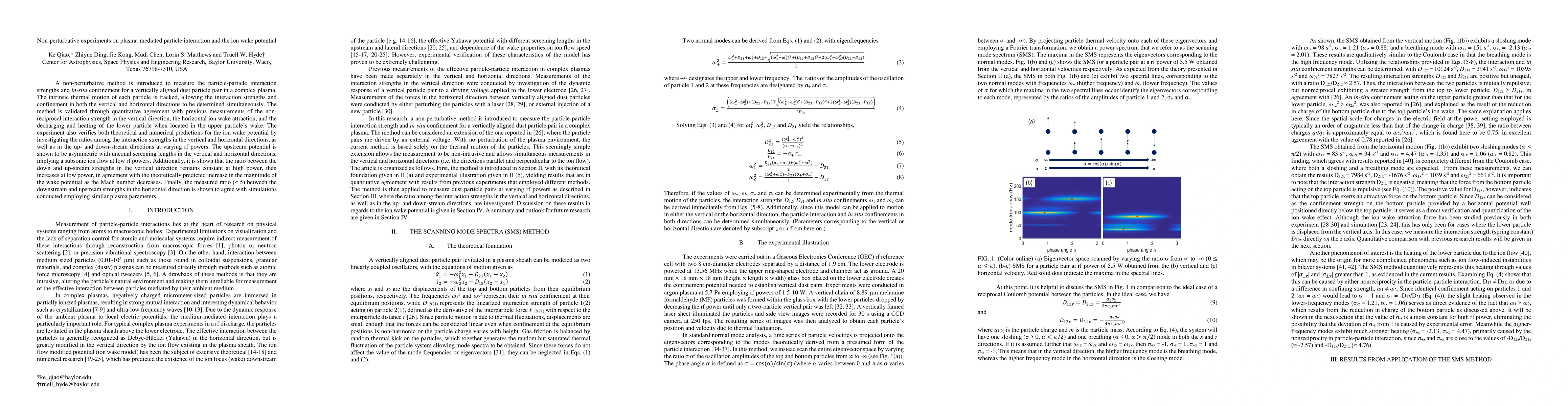 The main technical contribution is the development and validation of the scanning mode spectra (SMS) method for measuring interaction strengths and in-situ confinement in complex plasmas, enabling simultaneous measurements in vertical and horizontal directions.